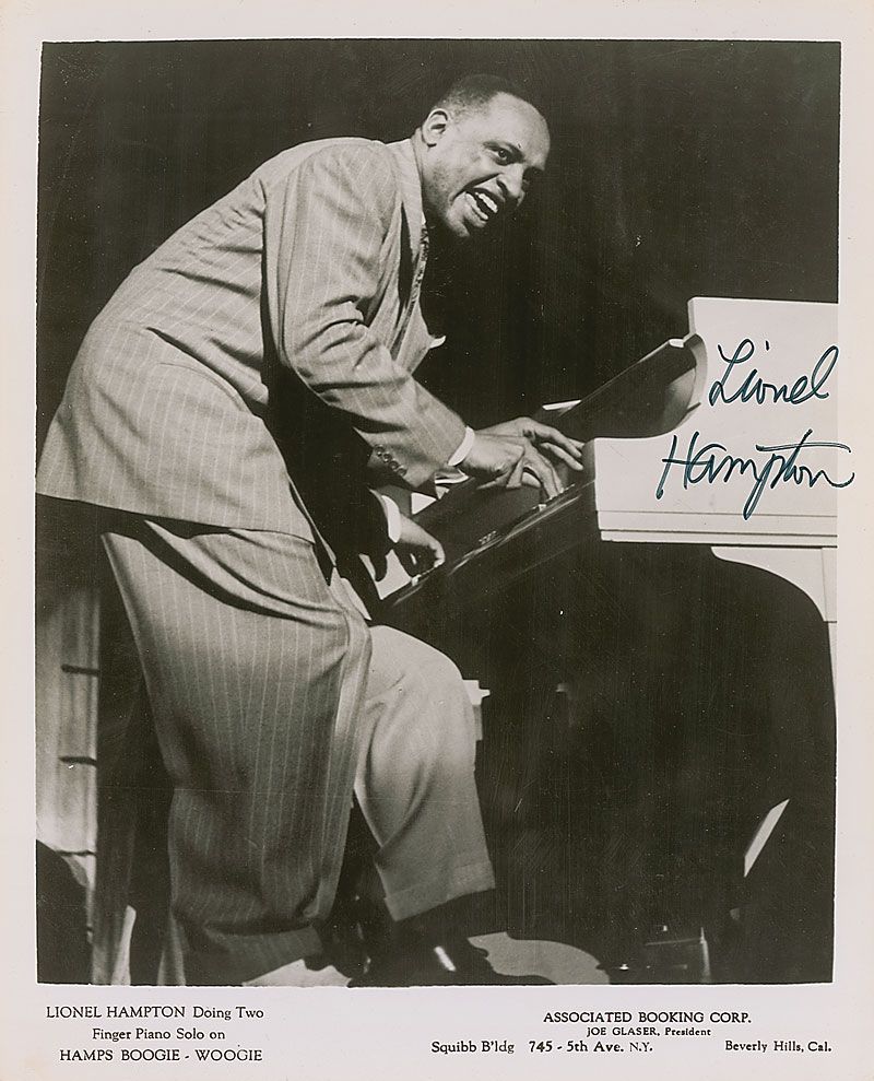 Glossy 8 x 10 publicity photo of Hampton doing a two-finger piano solo, signed in black felt tip. In fine condition.