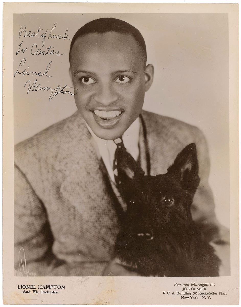 Vintage glossy 8 x 10.25 publicity photo of Hampton posing with a Scottish terrier, signed and inscribed in black ink, “Best of Luck, To Carter, Lionel Hampton.” A small tear to bottom right edge, slight scattered creasing, and some toning to lower border, otherwise fine condition.
