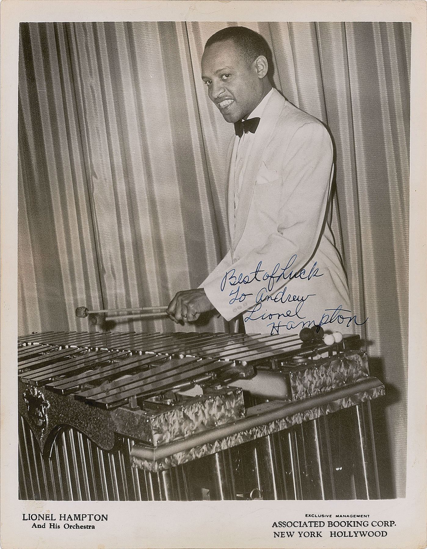 Vintage glossy 8 x 10.25 publicity photo of Hampton wearing a white suit and playing a xylophone, signed and inscribed in fountain pen, "Best of Luck to Andrew, Lionel Hampton.” In fine condition, with scattered light creasing.