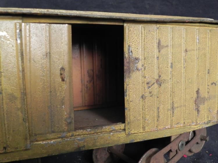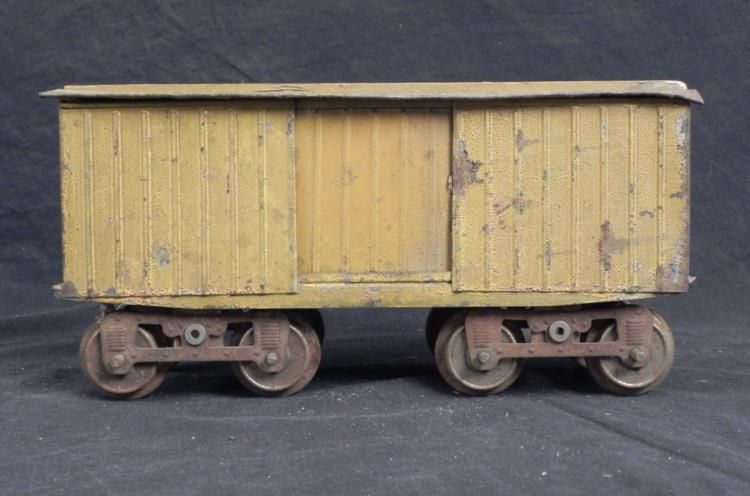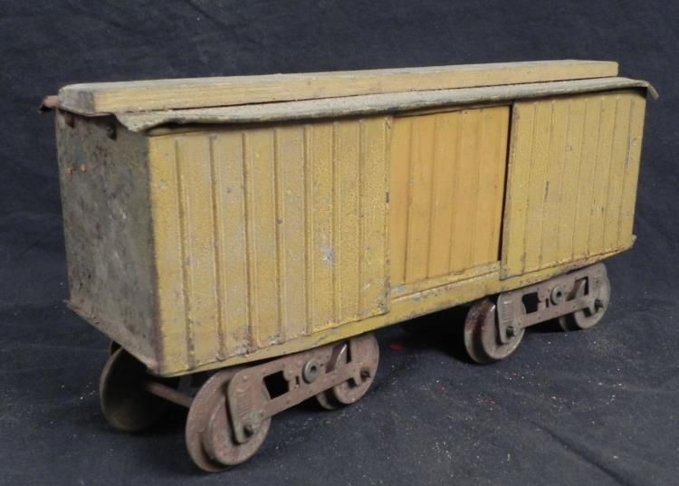 This is a pre-war era Lionel railroad slat car. It is in good condition, with paint wear and minor dents. It needs a good cleaning, and is untested. The size is a large guage, 2" wide at the wheels. It is tin bodied with a wooden structure composing the roof. This is similar to early Lionel cars that appeared in window displays. It is unmarked.This is a fine car for the collector of very early Lionel large guage.