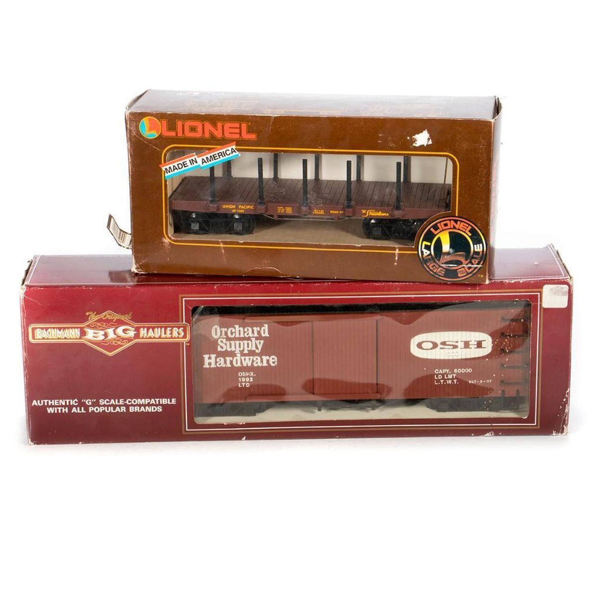 Lionel Large Scale 8-87504 Union Pacific Flat Car with Stakes in original well worn box. One coupler broken off.; Bachman Big Hauler G scale 93396 Orchard Supply Hardware Brown Box Car with Opening Doors. Handrails, roofwalks and brake wheel intact in worn original box.