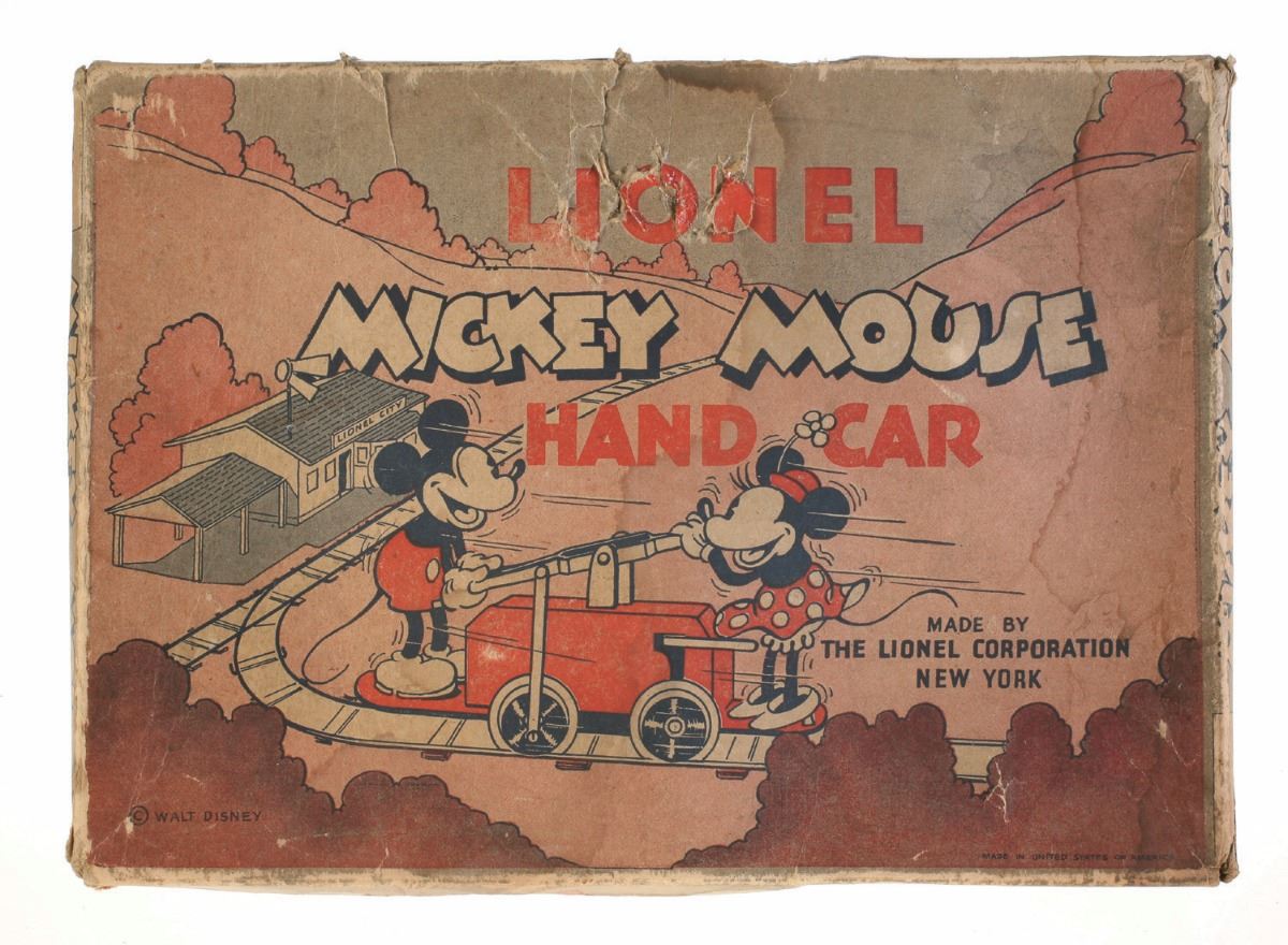 (Lionel Trains, 1934) This Mickey and Minnie hand car is the toy that saved the Lionel Corporation. Comes with the original 8.5"x11.25"x6" box, turn key, and (8) sections of track. Hand car and track are in very good condition with some wear from use. Box had considerable wear from age and use.
