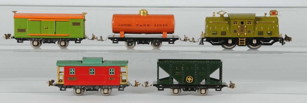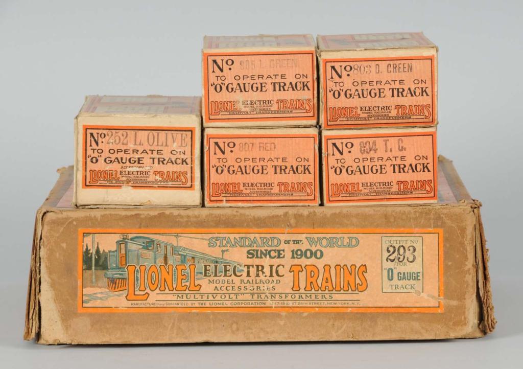 Pre-war. Includes 293 set box and individual boxes. Set includes 252 electric locomotive in olive, 804 Lionel Tank Lines tank car in terracotta, 803 Lionel dark green hopper, 807 peacock and red caboose, and 805 pea green and orange roof boxcar. Set box in excellent to excellent plus condition. Individual boxes are in excellent plus to like-new condition. Locomotive box shows some outer wear. Difficult set to find in this condition. Lionel tank car and hopper retain original mint patina. Overall set is excellent plus to like-new condition with a few minor blemishes. Pre-war Train