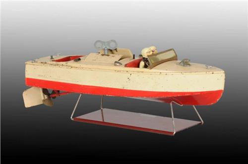 Description Pre-war. Includes reproduction stand, figures and key. Paint shows considerable pitting and rust. Clockwork motor is not working. Overall condition of lot is fair to good.