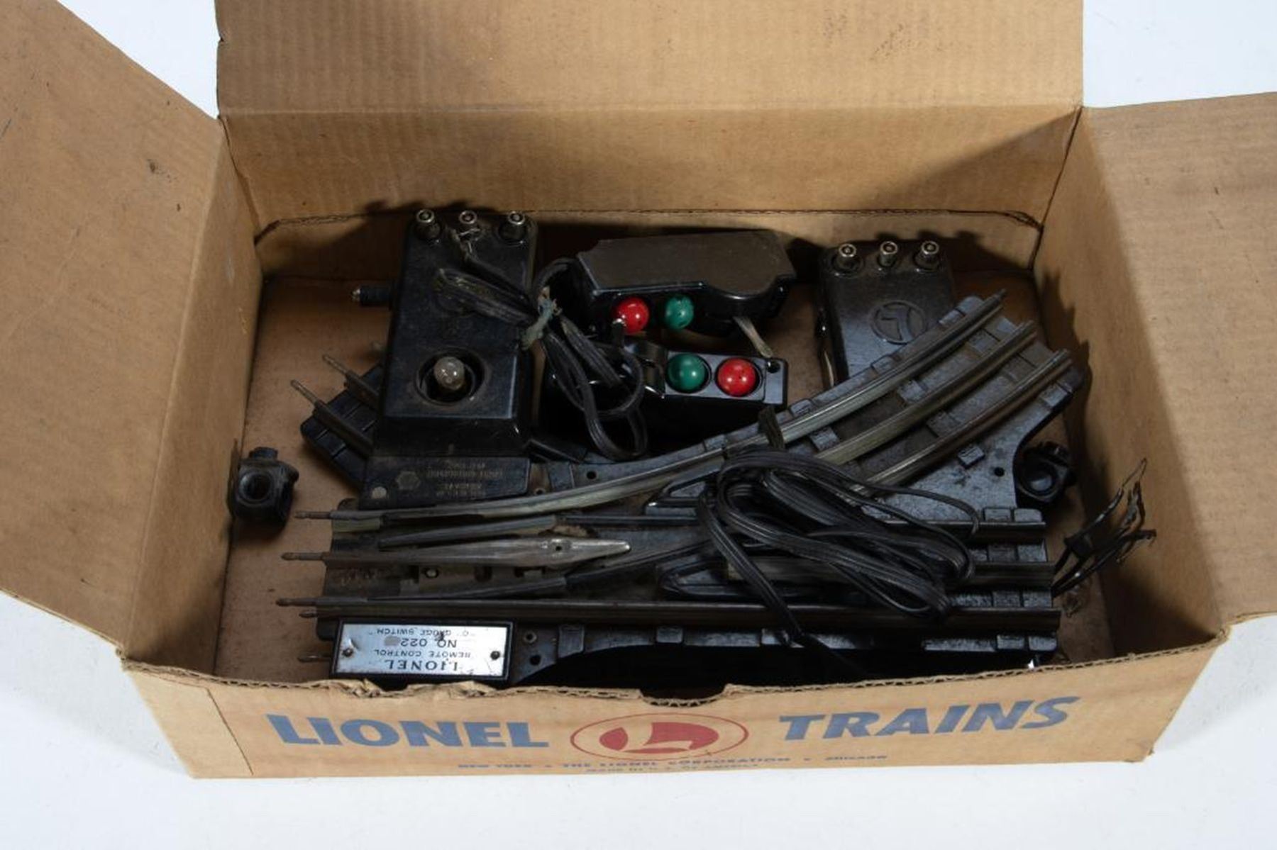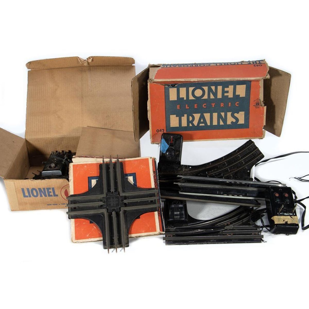 Lionel Boxed Pair O-42 Switches, Boxed Pair O-22 Switches, Loose O-22 Left Switch, (4) Remote Control Track Section, O-20 Crossing with partial box. Boxes are rough. Some pieces have rust spots.