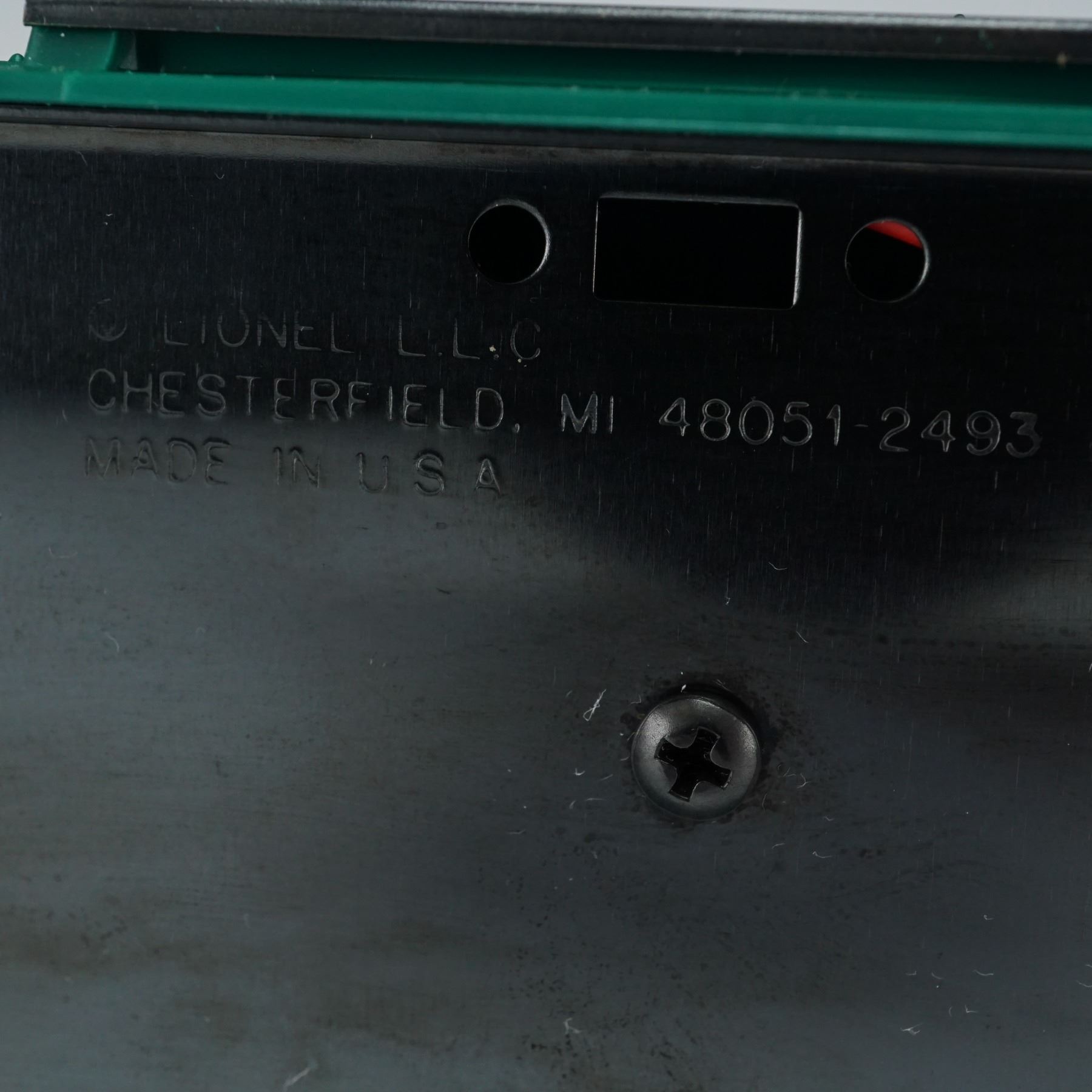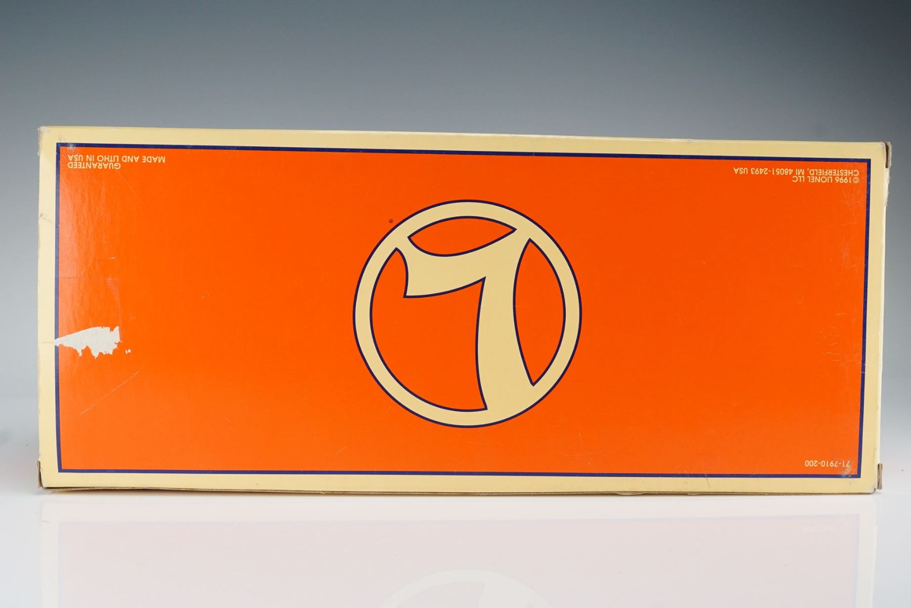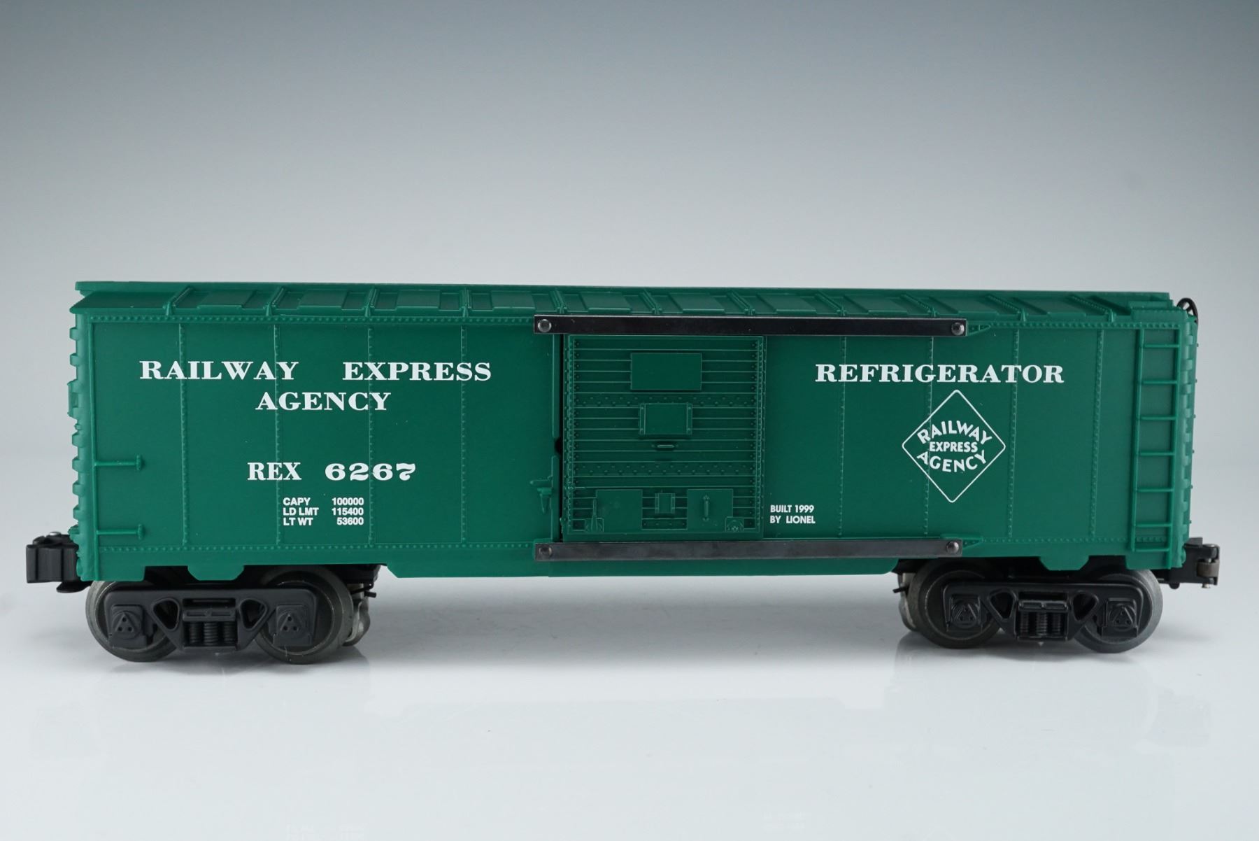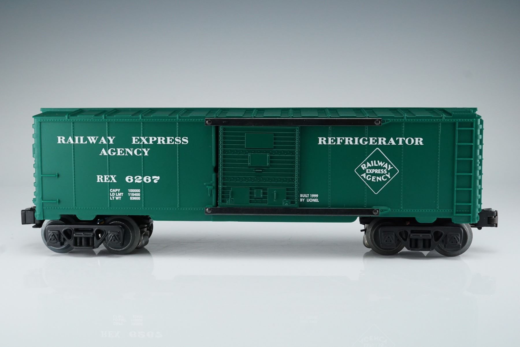 This Lionel Railway Express Agency 6267 boxcar features a deep green body with white stenciling, denoting it as a refrigerator car from the Railway Express Agency. Built in 1999 by Lionel, this model includes sliding doors and authentic detail true to the O gauge series. It comes with its original orange and cream Lionel box and vintage Lionel Railroader Club paperwork. The underside is marked "Lionel L.L.C., Chesterfield, MI 48051-2493, Made in U.S.A." A collectible addition for model railroad enthusiasts and Lionel collectors.