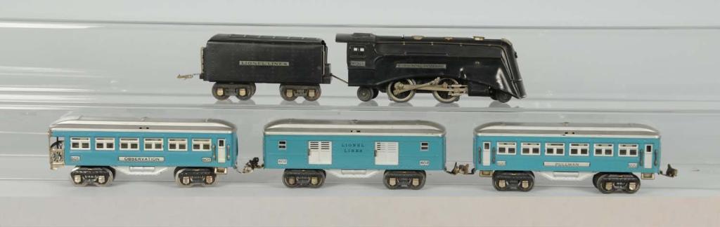 Pre-war. Includes all original individual boxes. Set includes 265E black locomotive and 265W tender, and three blue and silver passenger cars numbered 600, 601 and 602. Boxes are in excellent condition. 265W tender box and 600 pullman box are missing one end flap on each. All boxes are rubber stamped in purple B for passenger cars meaning blue. Locomotive cab roof is fatigued and broken. Broiler is very good but needs cleaning. Tender shows a small ding on roof but otherwise very good to excellent condition. Passenger cars have dirty silver roofs with nice clean light blue sides. Wheels show pitting as well as couplers. Overall condition of cars is very good plus. Pre-war Train