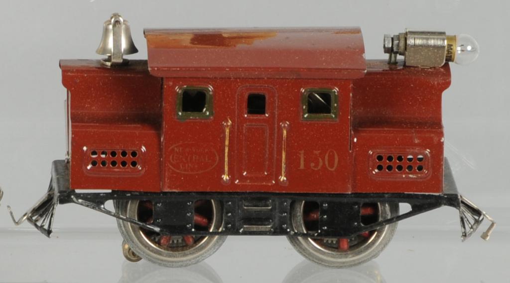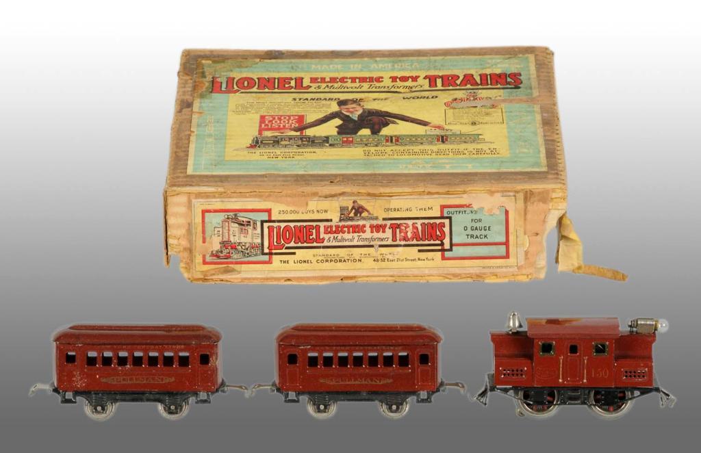 Pre-war. Includes original set box and inner sleeve. Set box is early teens to 1920s. Set includes 150 locomotive in unusual chocolate brown color, 600 chocolate brown pullman car, and 600 chocolate brown pullman car. Set box is in very good condition but a bit tattered. Locomotive has minor surface pitting to the roof but overall excellent plus condition. Cars show minor disturbances to the roofs but overall excellent plus condition. Nice matching set in a very unusual color and hard to find condition. Pre-war Train