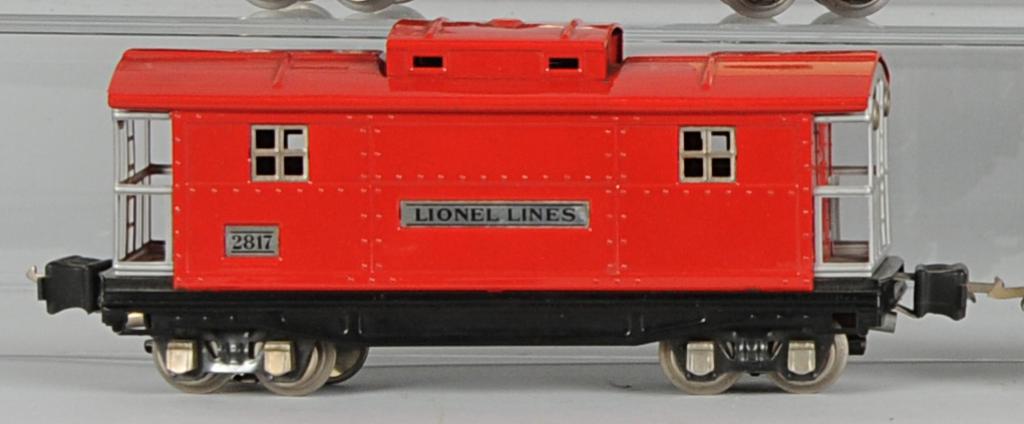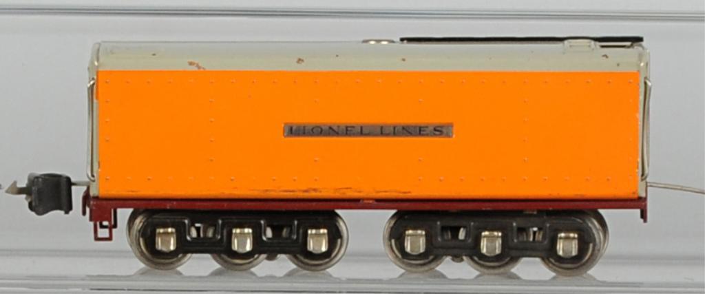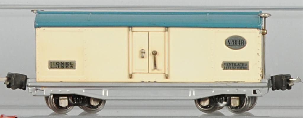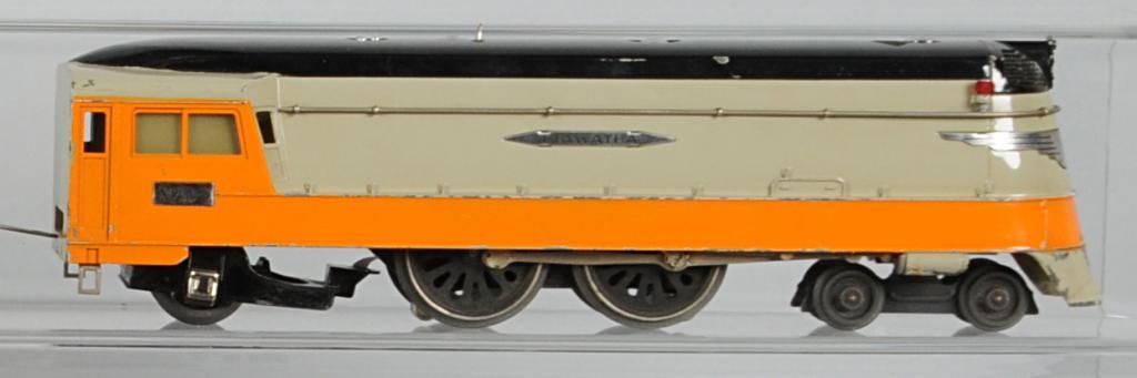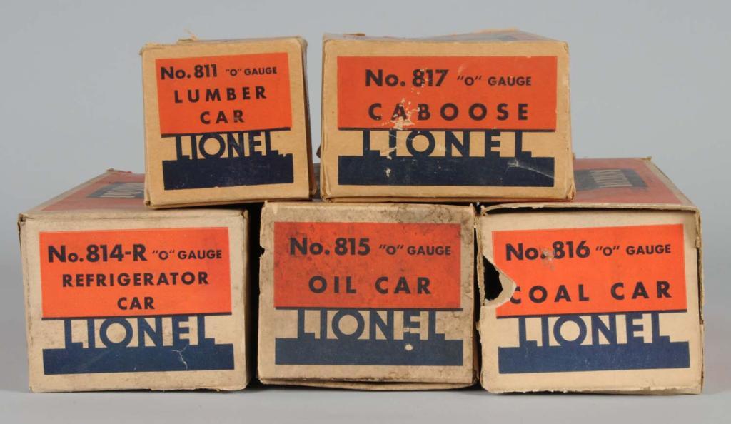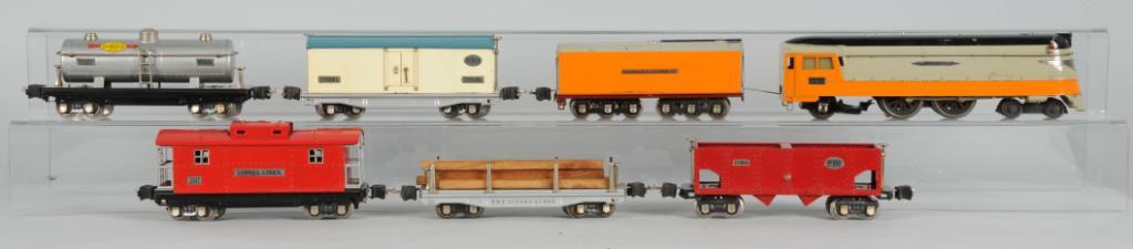 Pre-war. Includes five original car boxes. Set includes 250E Hiawatha streamline locomotive, 250W Hiawatha streamline tender, 814R light blue and white reefer, 815 silver Sunoco tank car, 811 all silver flat car car, 816 all red hopper, and 2817 all red caboose. All car boxes are tattered and missing end flaps and are in fair to good condition. Locomotive is in excellent condition with chipping to front nose. Tender shows minor sporadic chips but is in overall excellent condition. Reefer is in excellent plus condition. Sunoco is in excellent to excellent plus condition with a few tiny chips to one decal. Silver flat has one loose stake and is in excellent to excellent plus condition. Hopper is in excellent to excellent plus condition. Caboose is in excellent plus condition with one small chip. Replaced back pony truck. Nice, clean, hard-to-find set. Pre-war Train