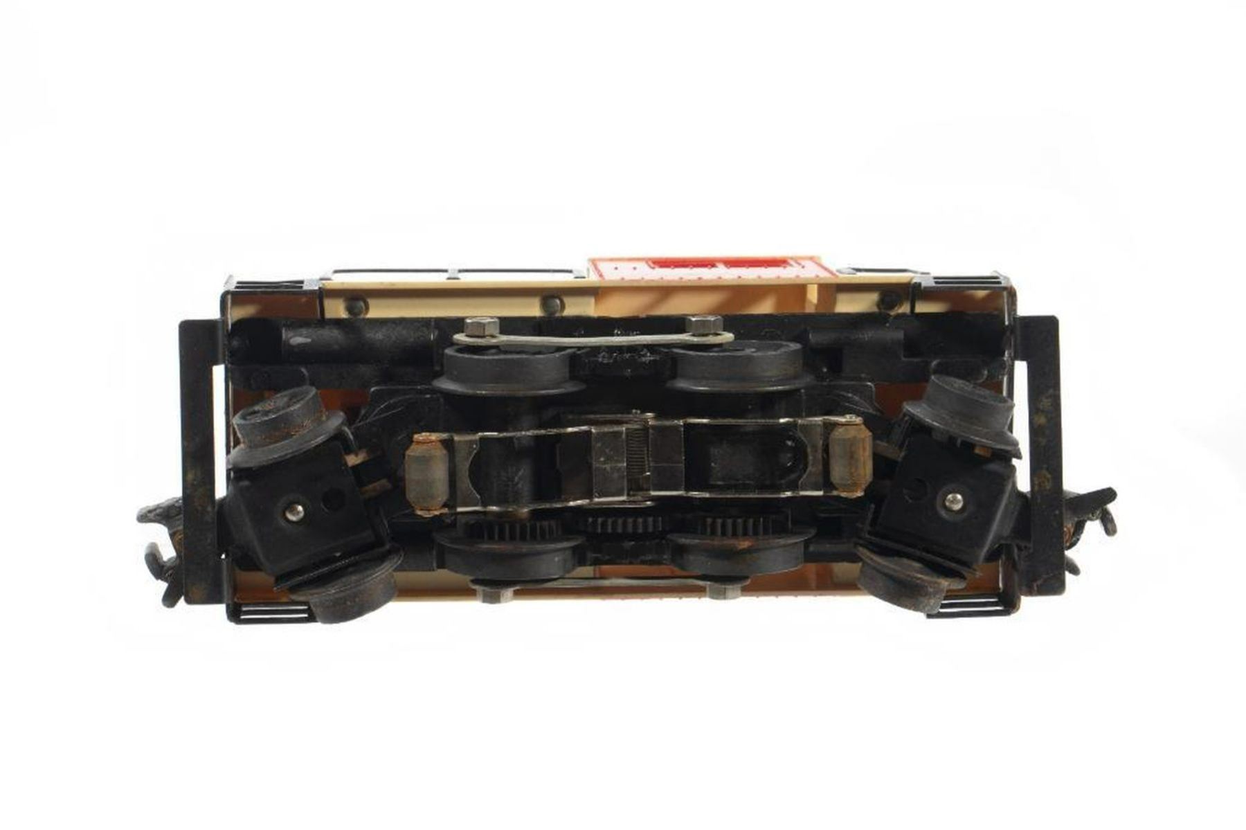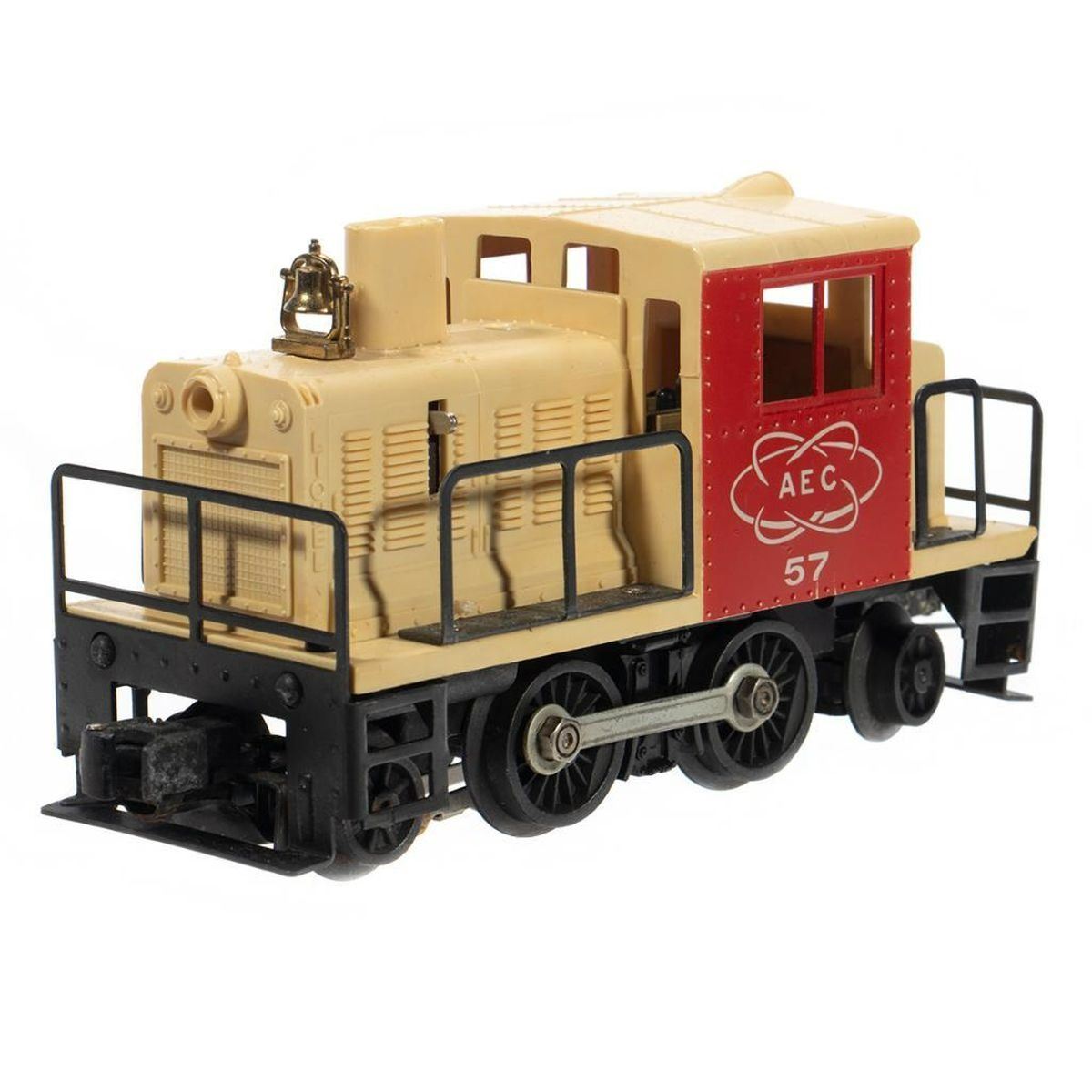 Lionel Postwar Number 57 Atomic Energy Commission Diesel Switcher.: Struts, bell and handrails intact.: Rust on pickups, rust spots on wheels.: