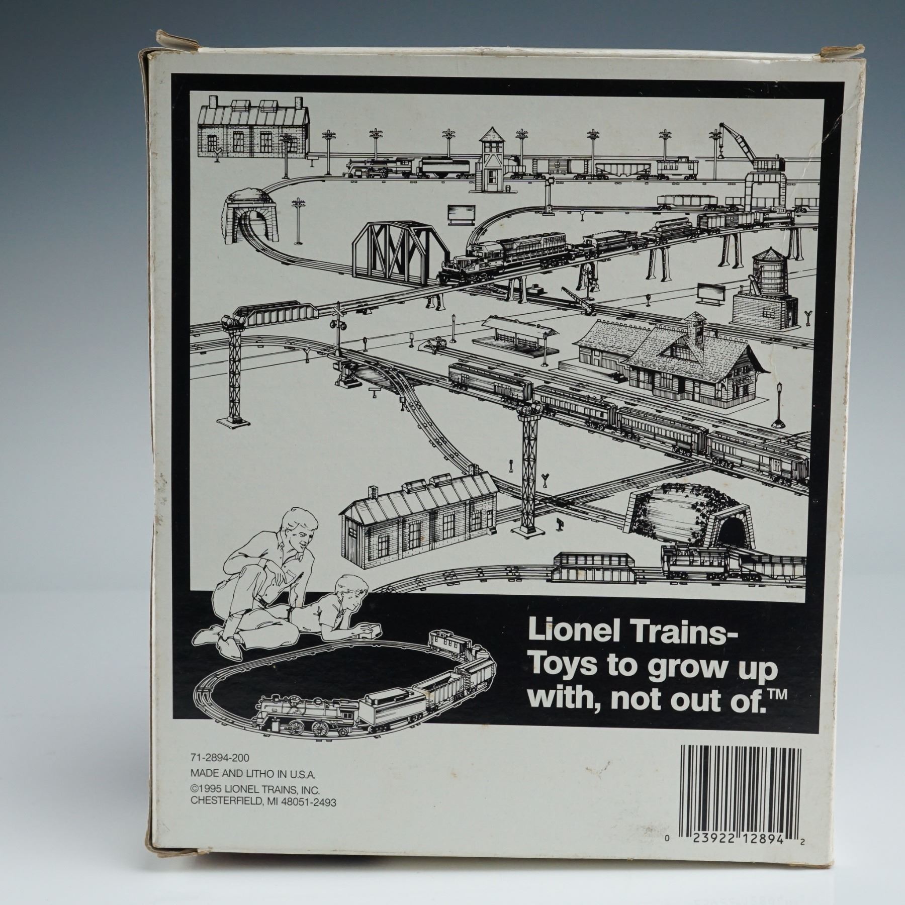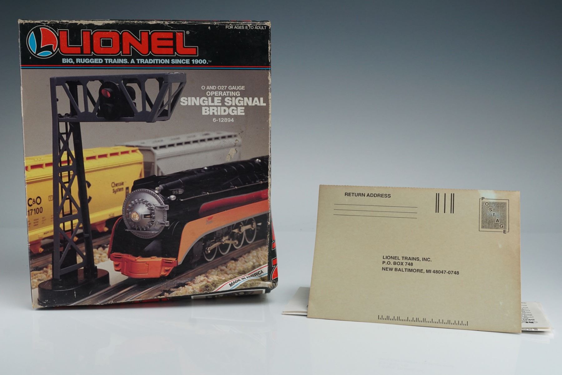 This Lionel operating single signal bridge (No. 6-12894) is designed for O and O27 gauge model train layouts. Produced by Lionel Trains, Inc. in 1995, the set is housed in the original packaging. The piece is part of Lionel's legacy of durable and detailed railway accessories.