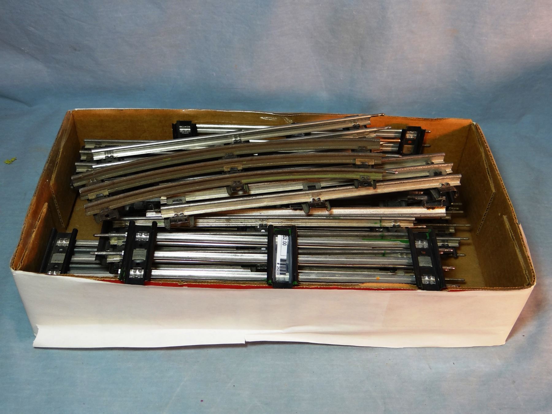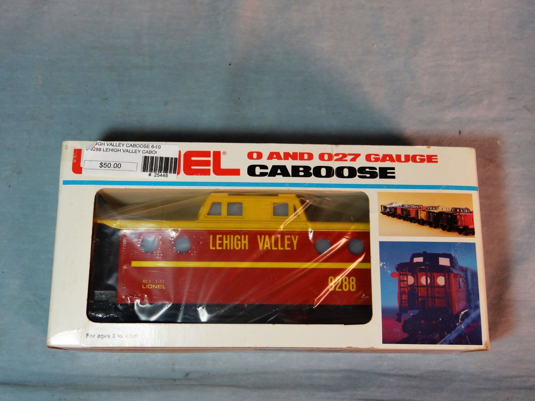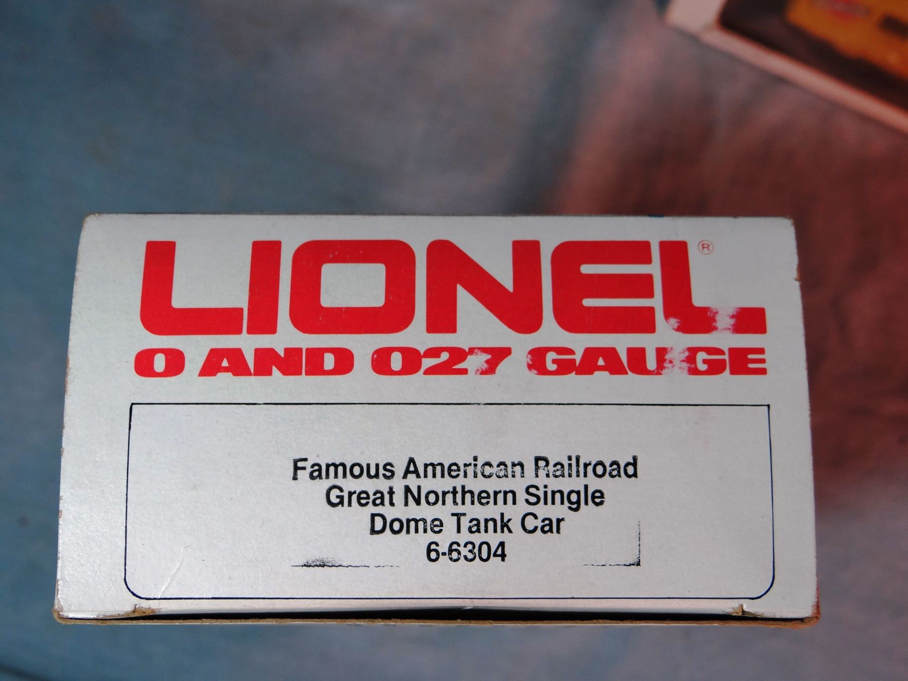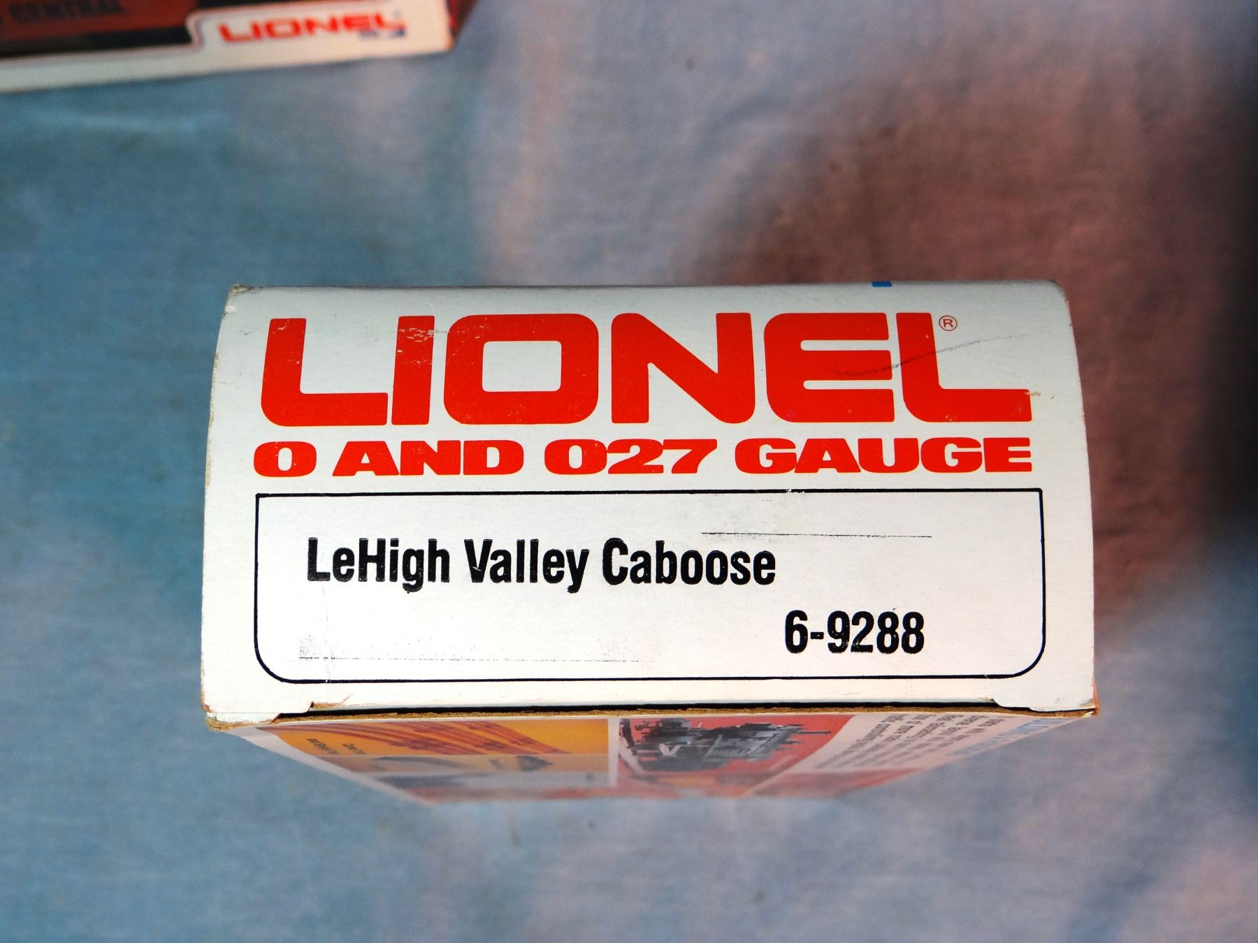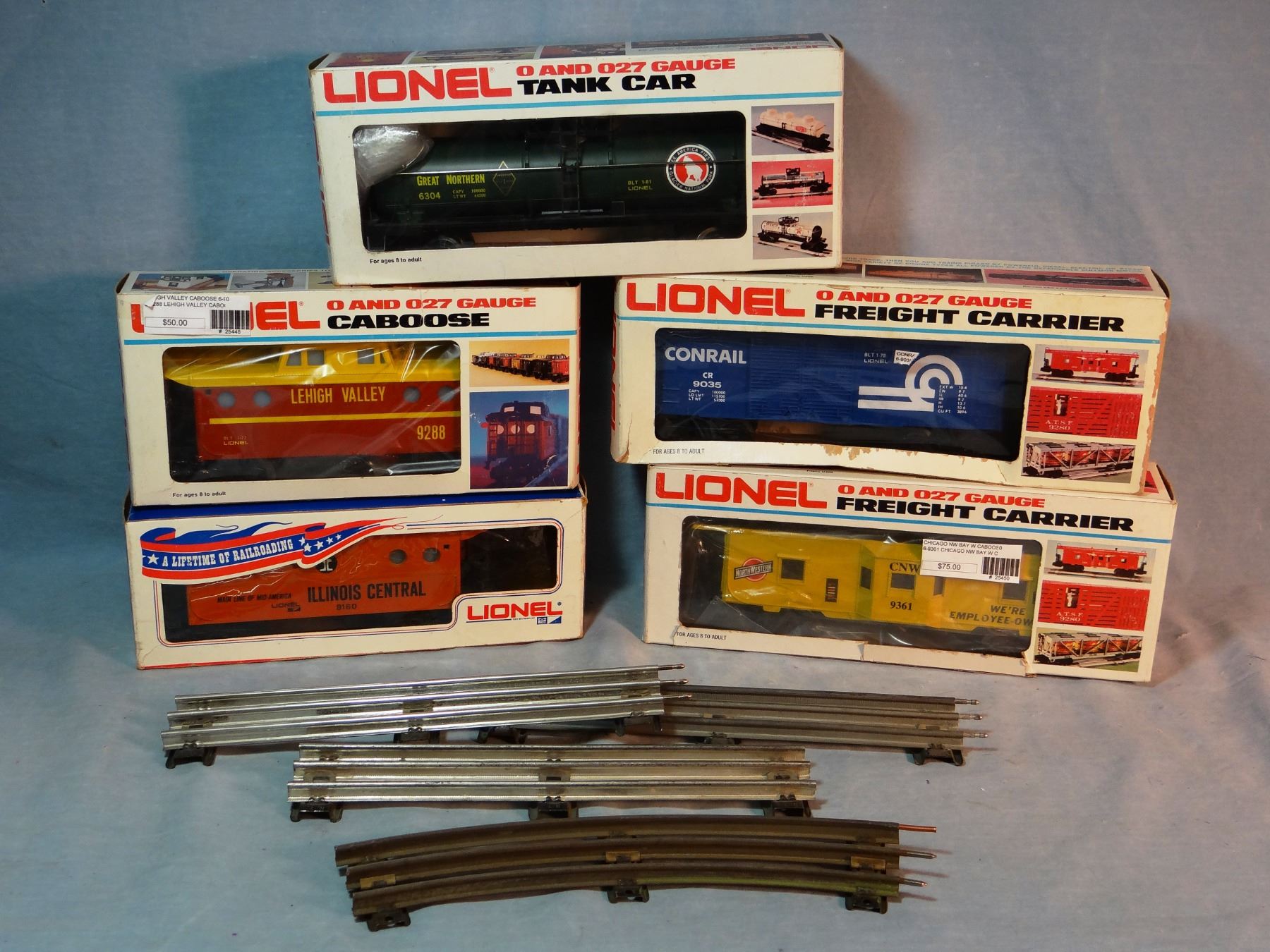 Lionel O gauge: 3 cabooses, tank car and box car, all NIB, and assorted used O gauge track