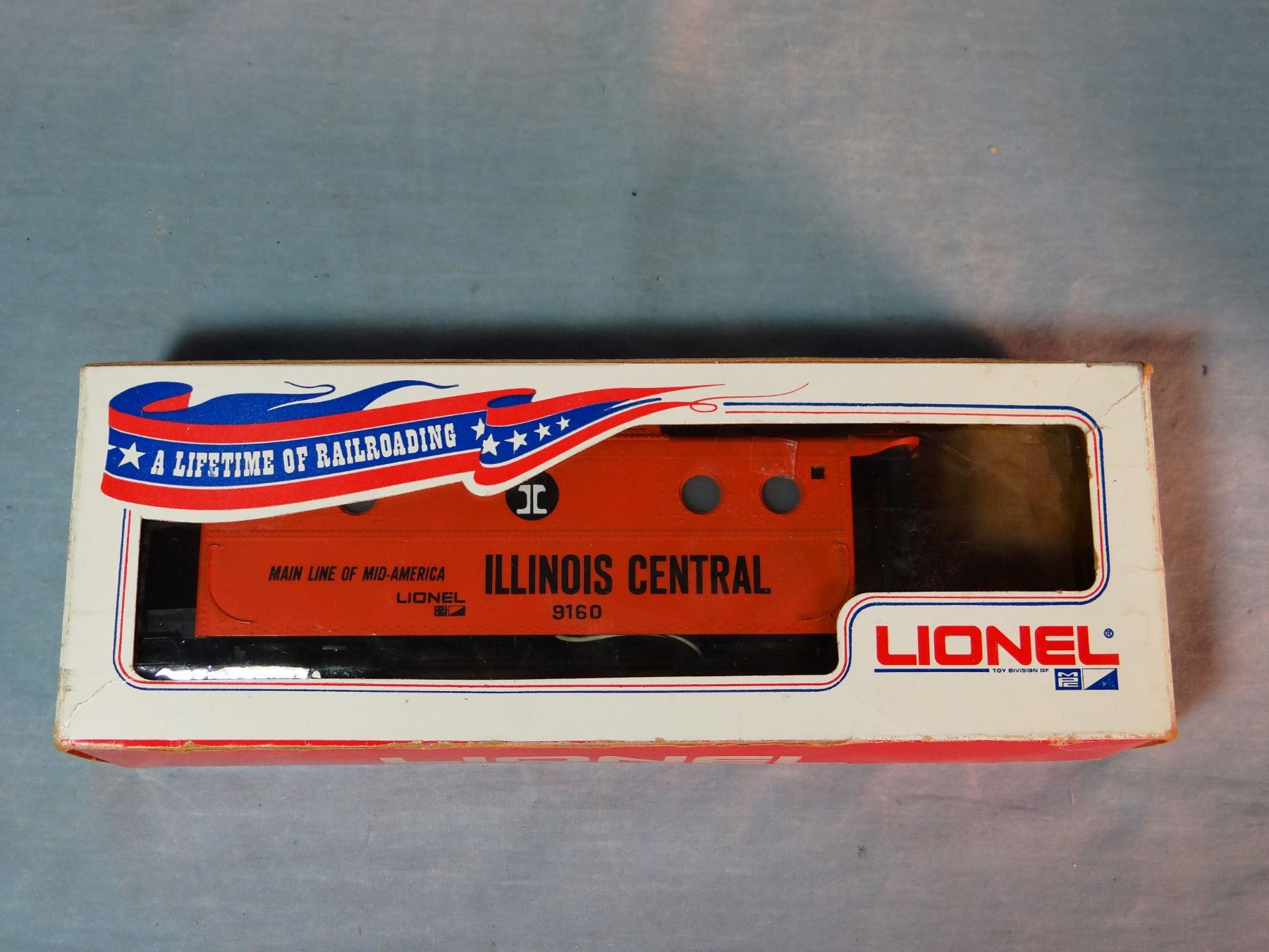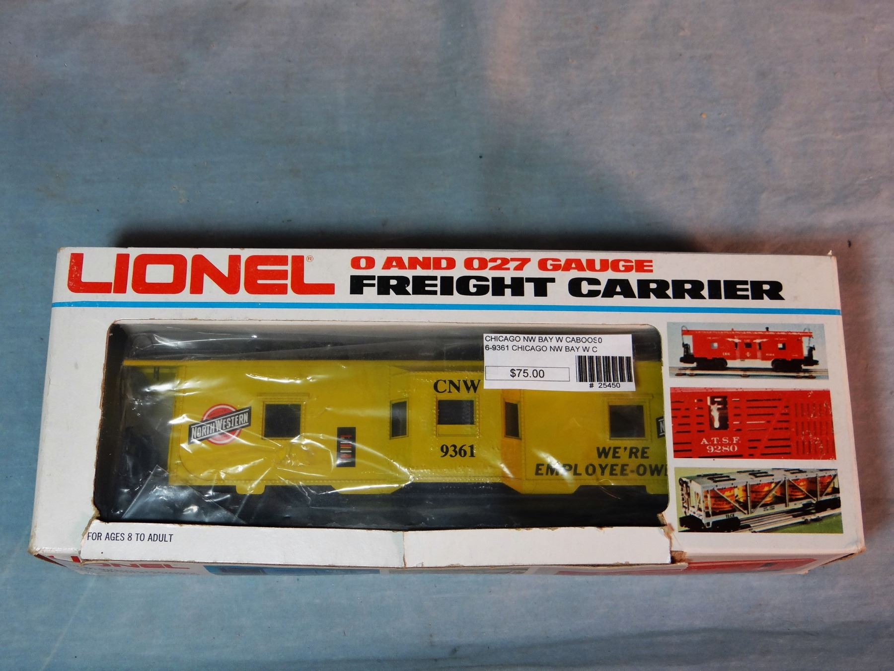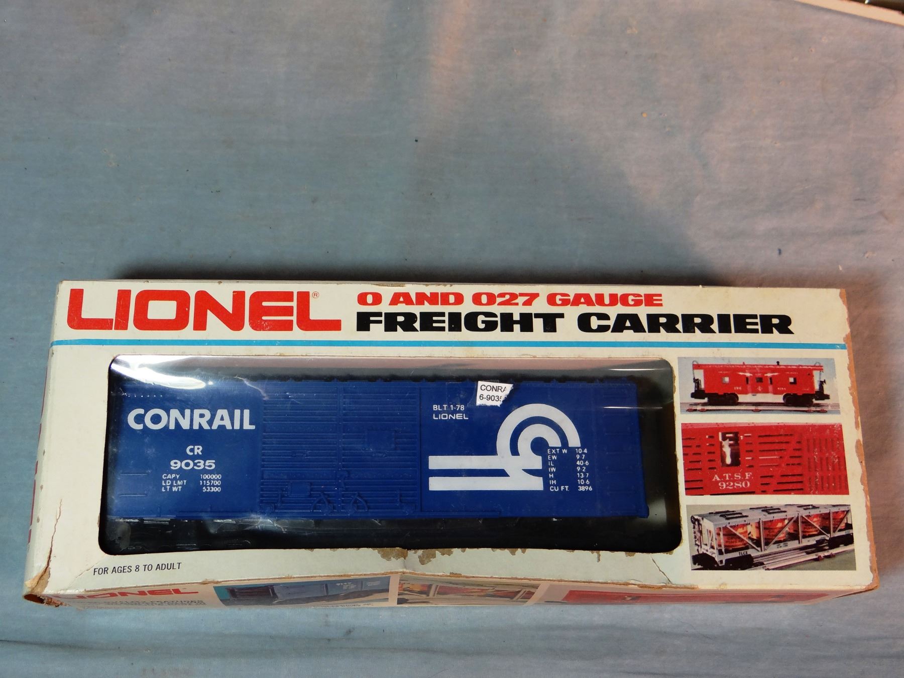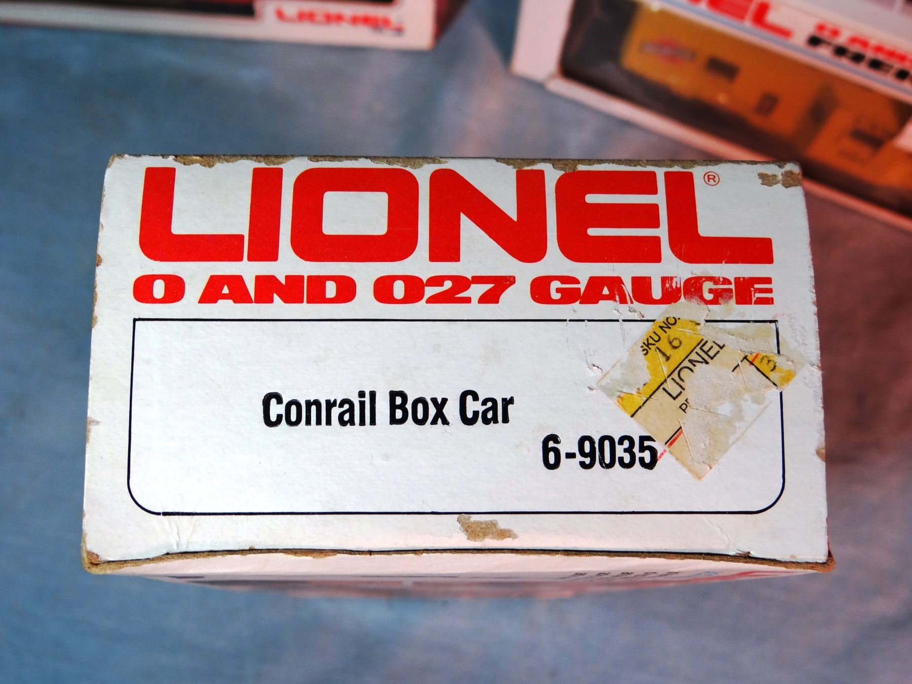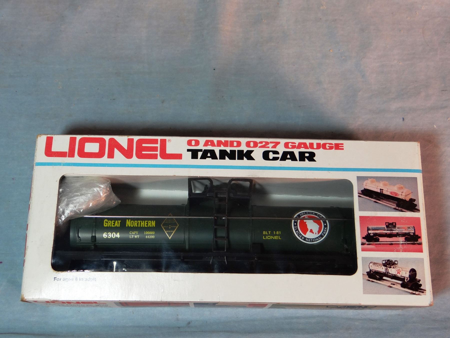 Lionel O gauge: 3 cabooses, tank car and box car, all NIB, and assorted used O gauge track