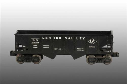 Description Post-war. Includes 6476 black Lehigh Valley hopper car stamped on one side only. No heat stamping at all. Nice conversation piece. Overall condition of lot is excellent plus to like-new.