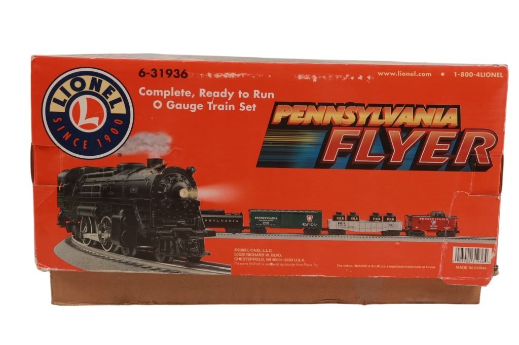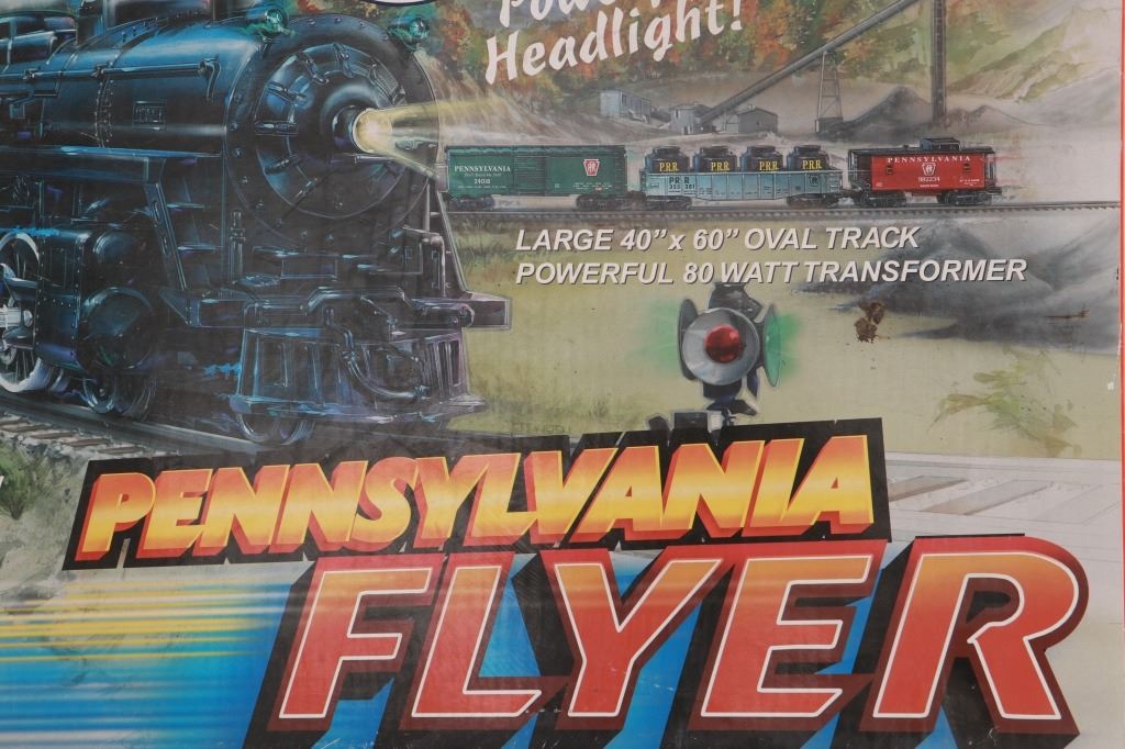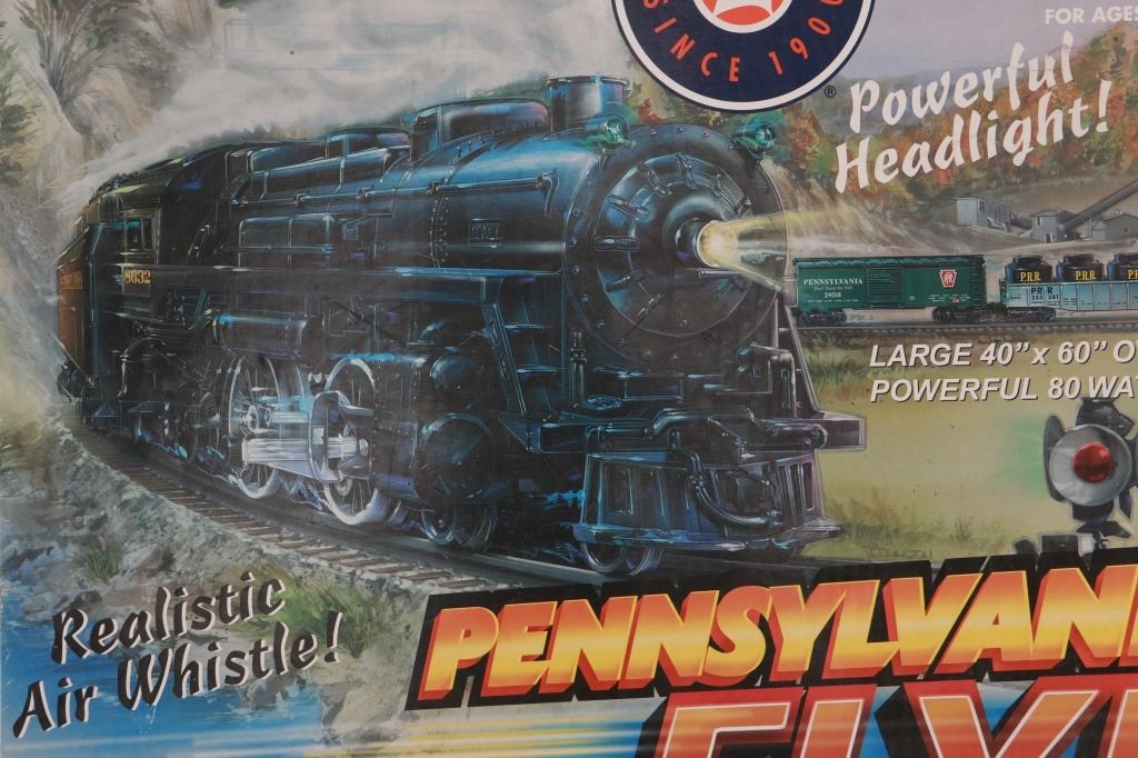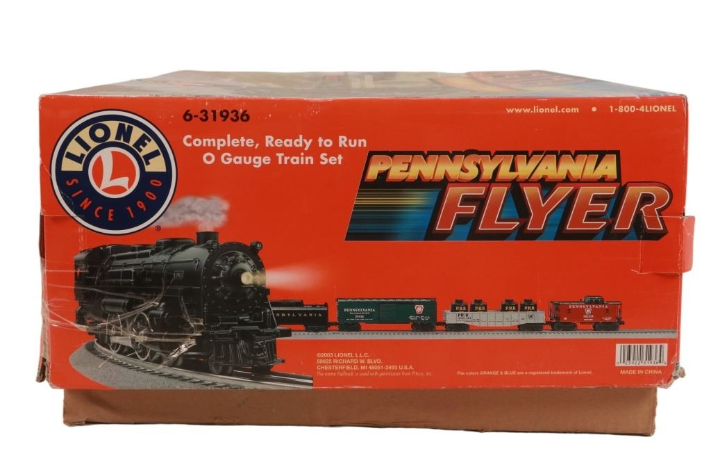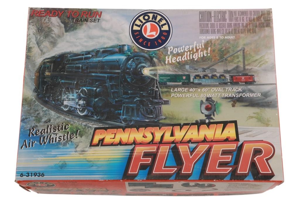 Featured in this lot is this Lionel Pennsylvania Flyer train set in its original box from 2004. The Pennsylvania Flyer is a classic O-gauge model train set produced by Lionel, designed to evoke the look and feel of historic Pennsylvania Railroad steam locomotives and rolling stock. The set includes the steam locomotive, a detailed 4-4-2 Pennsylvania-style engine with working lights and puffing smoke unit, a transformer control for forward/reverse, lights and whistle buttons, a boxcar, a gondola and a caboose. Sections of straight and curved track are included as well as a power supply. It comes in its original box showing the Pennsylvania style engine front and center and reads, "Pennsylvania Flyer" below it. It shows good condition overall with slight wear present from its age and use over the years, but no major signs of damage is noted. The box measures 17 7/8" L x 25 3/8" W x 10" H and weighs 21 pounds and 6 ounces.