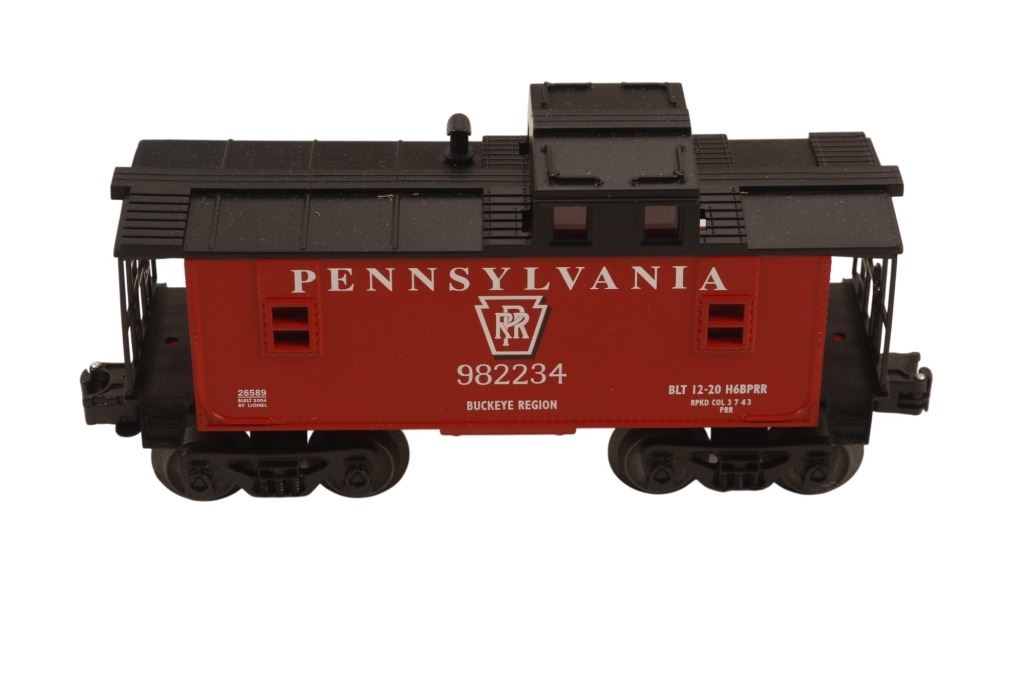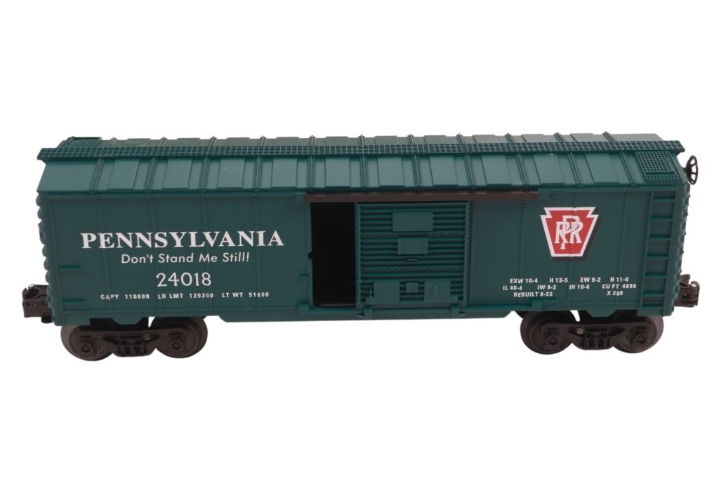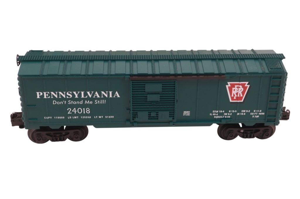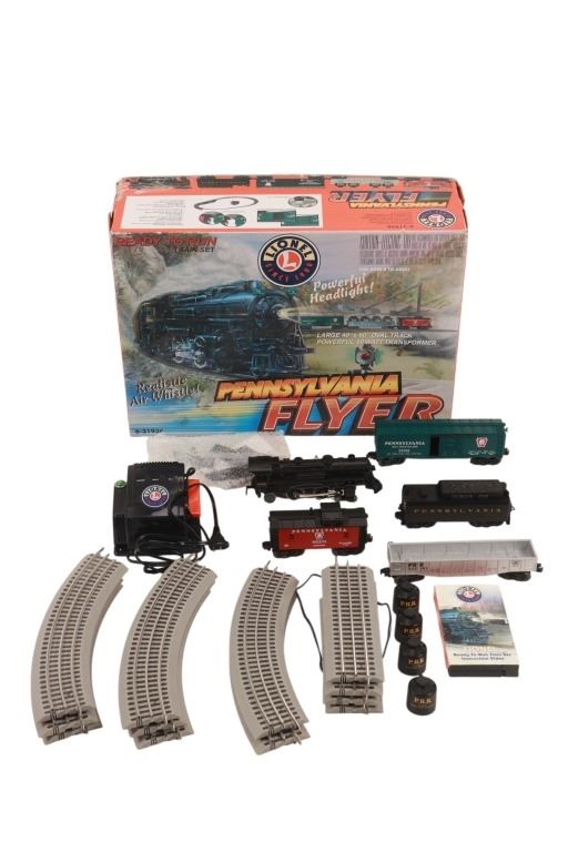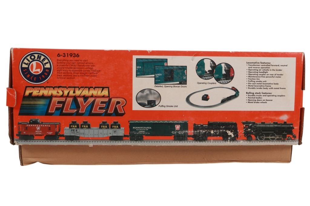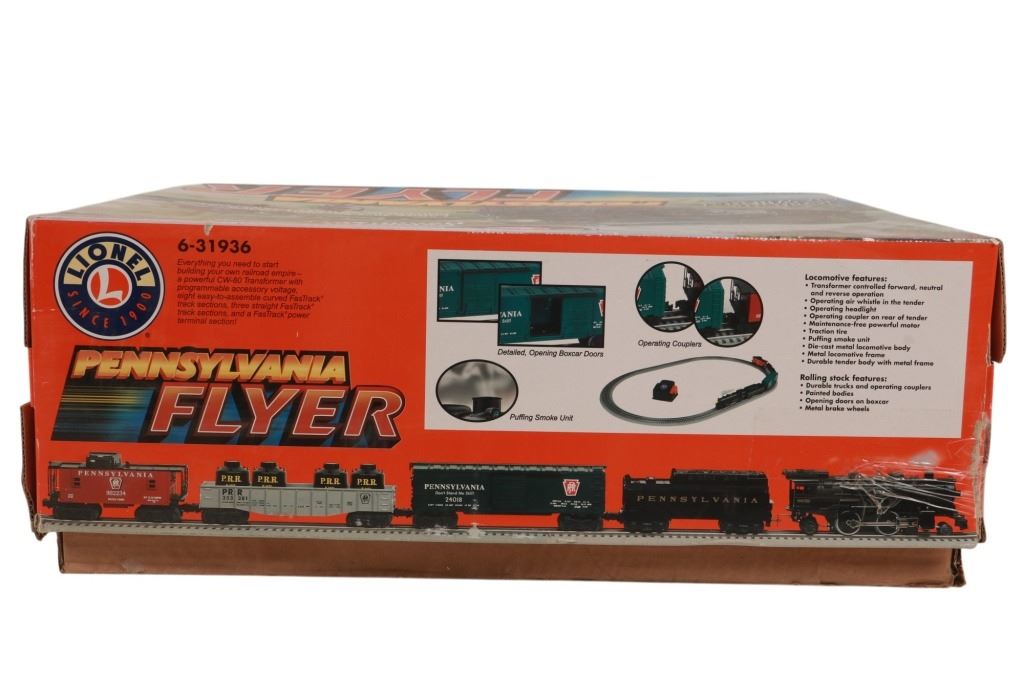 Featured in this lot is this Lionel Pennsylvania Flyer train set in its original box from 2004. The Pennsylvania Flyer is a classic O-gauge model train set produced by Lionel, designed to evoke the look and feel of historic Pennsylvania Railroad steam locomotives and rolling stock. The set includes the steam locomotive, a detailed 4-4-2 Pennsylvania-style engine with working lights and puffing smoke unit, a transformer control for forward/reverse, lights and whistle buttons, a boxcar, a gondola and a caboose. Sections of straight and curved track are included as well as a power supply. It comes in its original box showing the Pennsylvania style engine front and center and reads, "Pennsylvania Flyer" below it. It shows good condition overall with slight wear present from its age and use over the years, but no major signs of damage is noted. The box measures 17 7/8" L x 25 3/8" W x 10" H and weighs 21 pounds and 6 ounces.