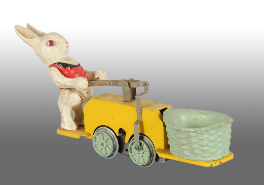 Pre-war. Clockwork mechanism is not working, forward and reverse are not working. Rabbit is missing one eye. Hand car needs cleaning. Paint is all present and in good condition. Very good to very good plus.