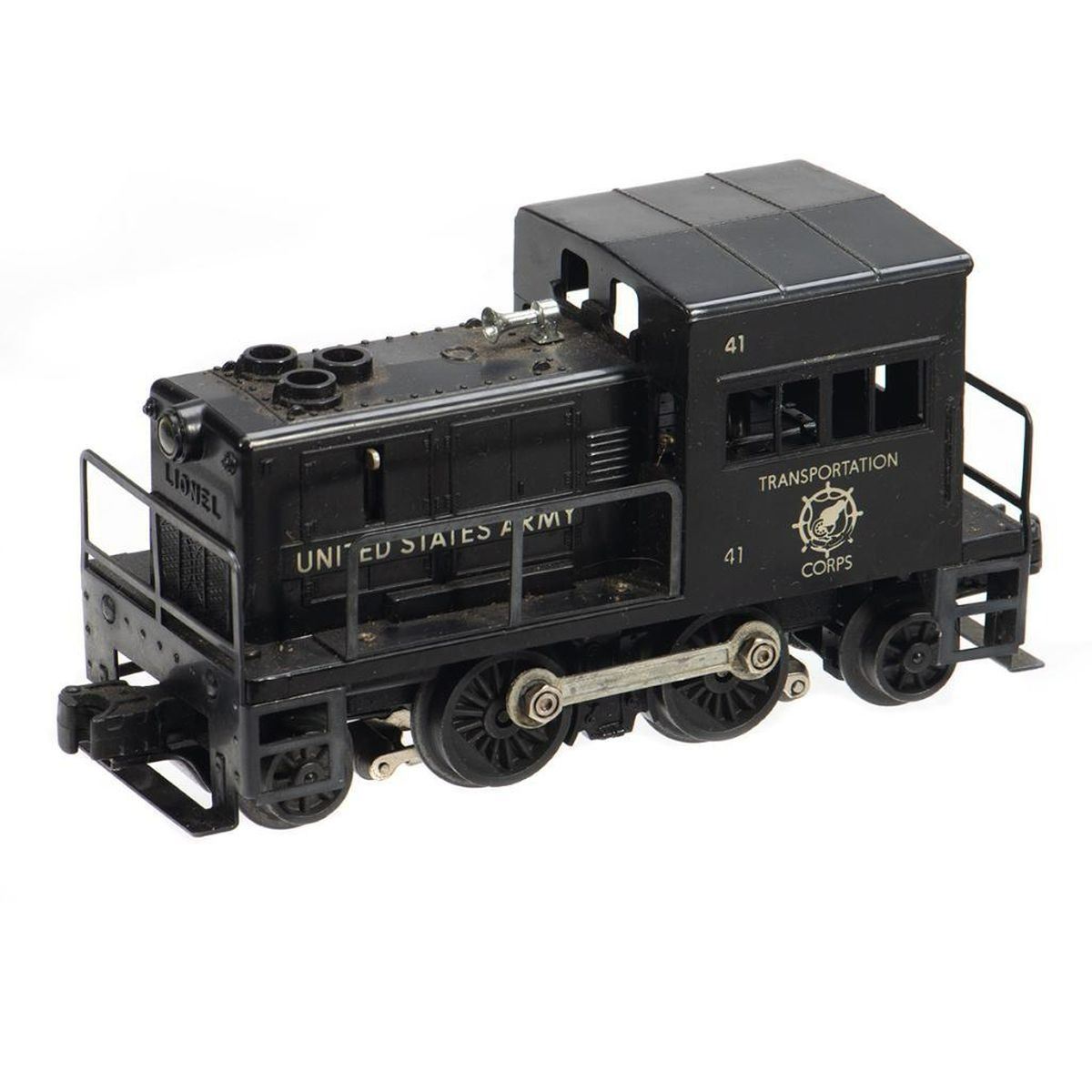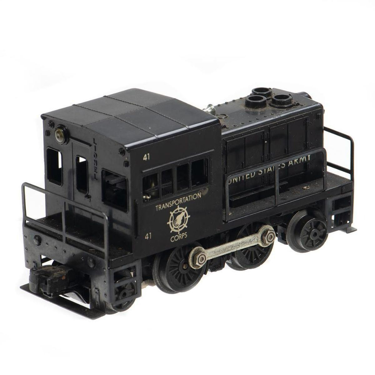 Lionel Postwar Black number 41 United States Army Switcher. Horn, handrails, struts, rods, couplers intact.