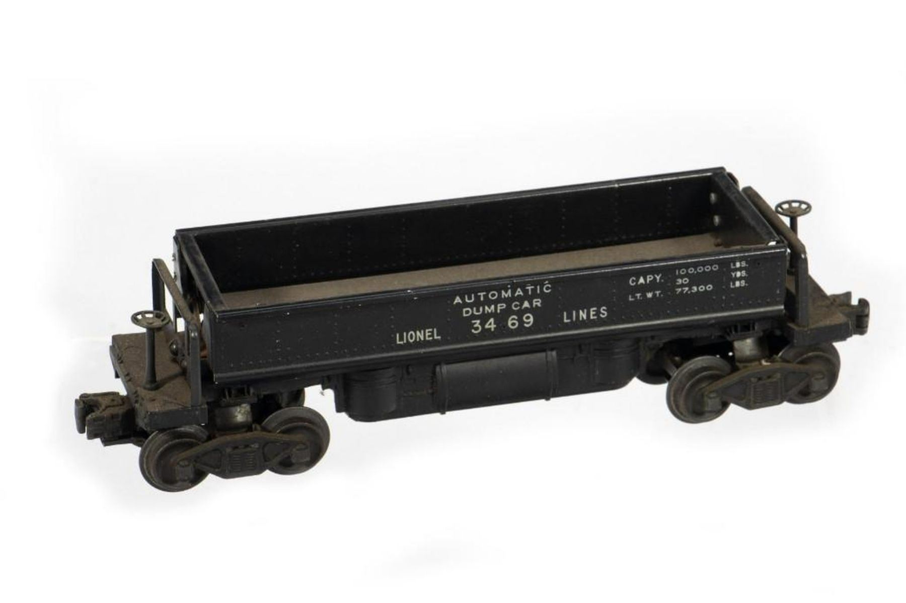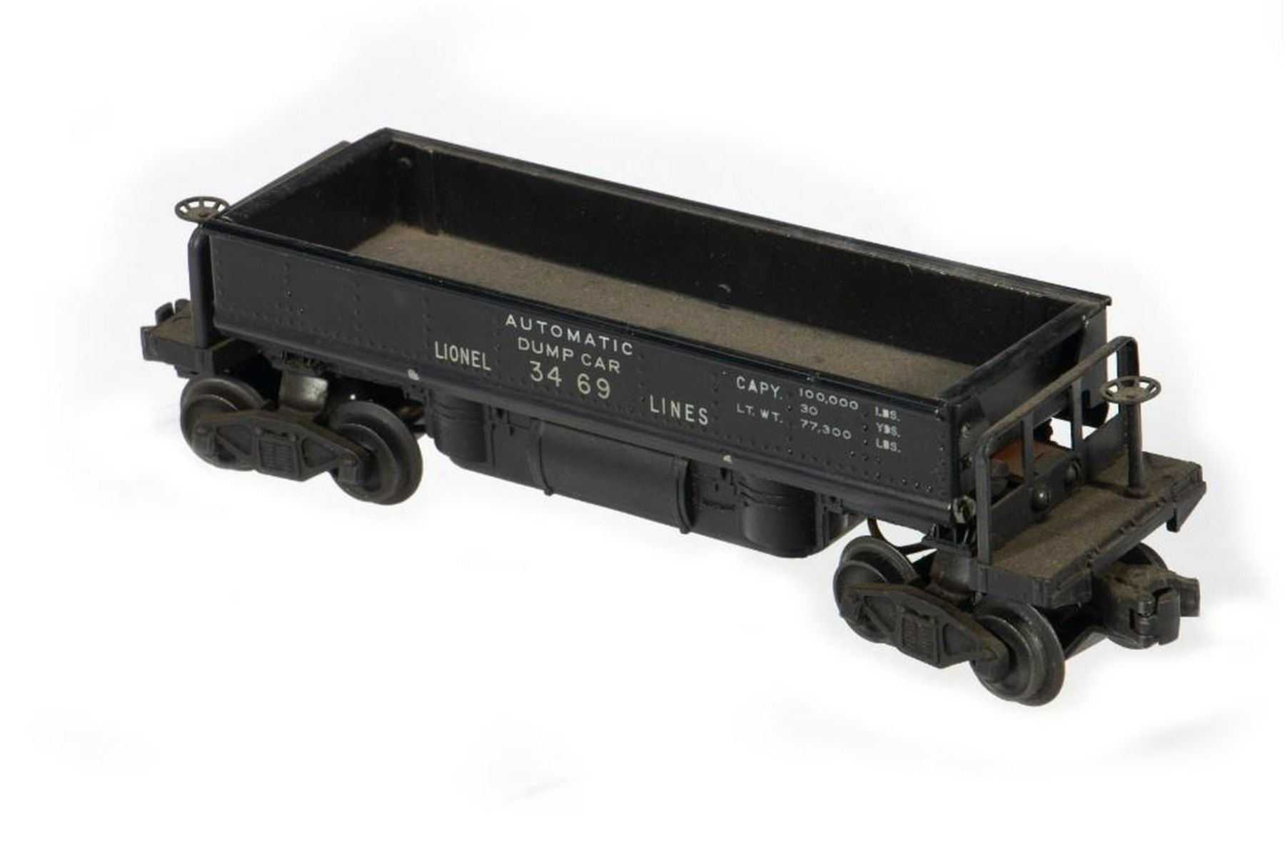 Lionel Postwar 3469 Automatic Dump Car. Dump tray, Flap, Bake Wheels/Stands, Trucks and Couplers intact. Flap has paint scrapes where it hits the chassis when open. Car is very dusty. Original box is numbered 3469X but has no flaps at all. Lots of shelf wear and tear.