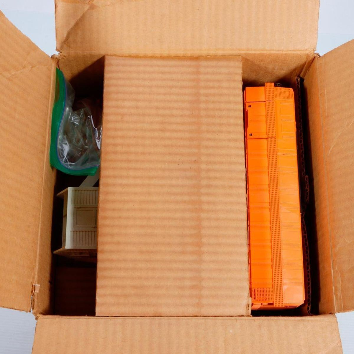 Lionel Postwar 352 Icing Station with red base. Man is present with broom. Roof is present. 6352 Oraange Pacific Fruit Express Reefer. Roof walk ends, brakewheel, door guides, doors, trucks and couplers along with icing hatch are intact. Wheels show no track time. Includes (11) reproduction ice cubes. Original box has insert. No ice cubes, no instructions.