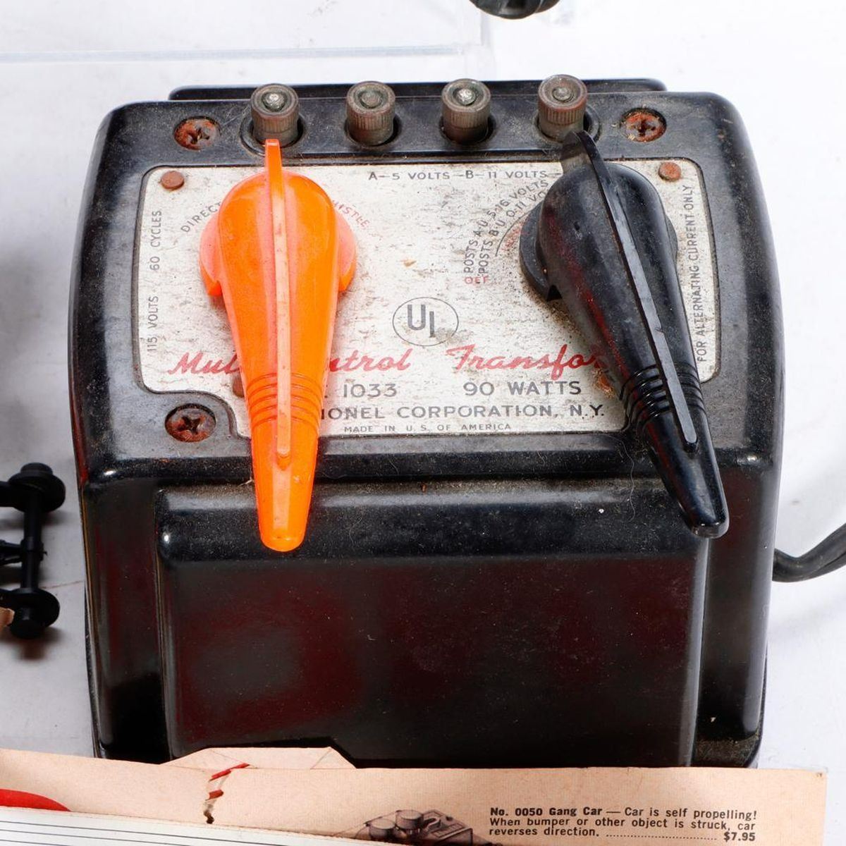 Lionel Postwar Freight Cars, Transformer and Parts 6544 Missile Firing Car with 4 missiles - trucks and couplers intact. Dirty 3484 Pennsylvania Merchandise Boxcar - trucks and couplers intact (with rust), roof walk ends intact, brake wheel present. Doors are off but present. Bottom door guides missing. Man is present. Mechanism and remaining door guides have rust. Dirty with spots of white on roofwalk. 6315 Gulf Tank Car. Trucks, couplers, hand rails, ladders, platform, brake wheel and hazard displays intact with rust. 6827 Black Lionel Flat Car. Trucks, couplers, steps and brake wheel intact with rust and dirt. 3656 Automatic Cattle Car in parts/broken. One cow. 3927 Track Cleaning Car. No bottles. Pads are dirty. Rust spots. 1033 90 watt transformer. Has knurled nuts and handles. Trestle Set Pieces P&H Boom Parts Misc Parts - some rusty. Misc paperwork pieces