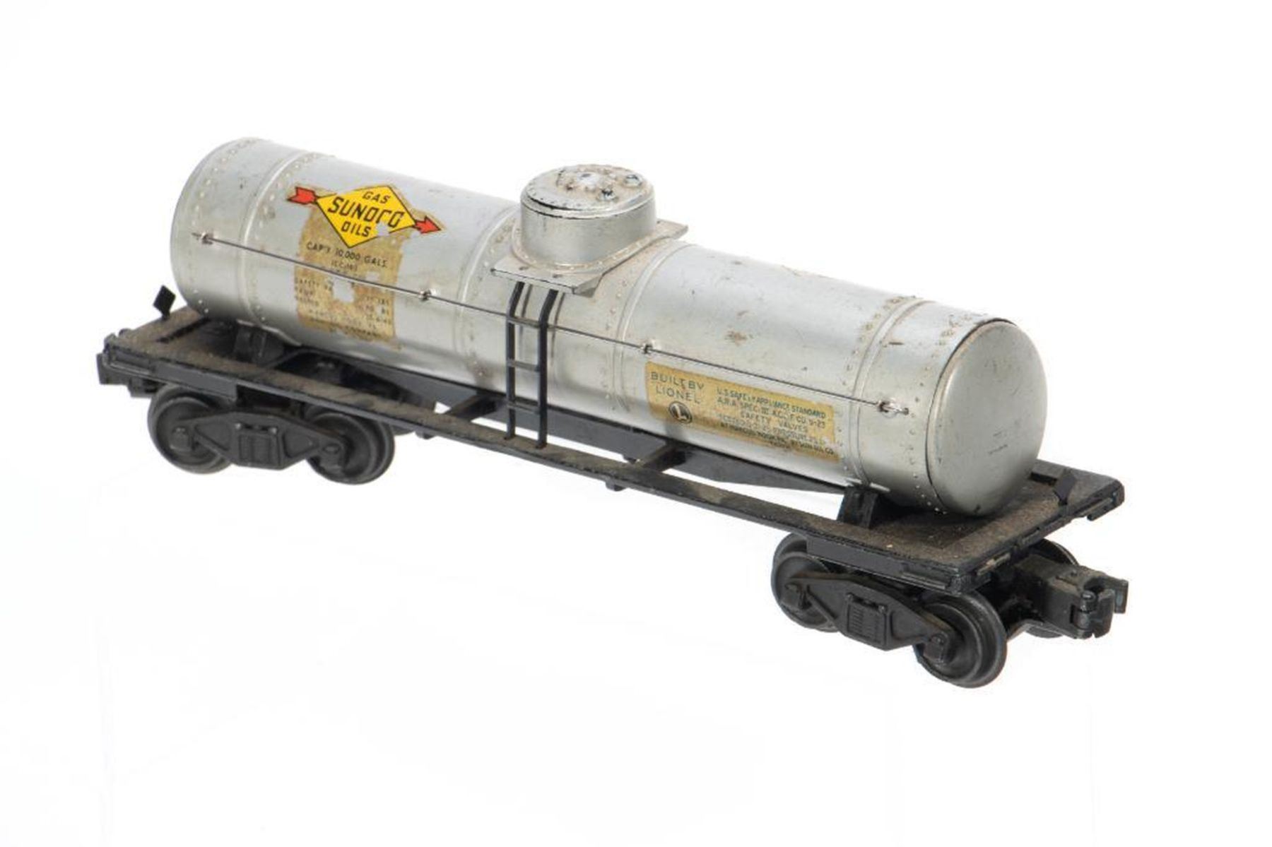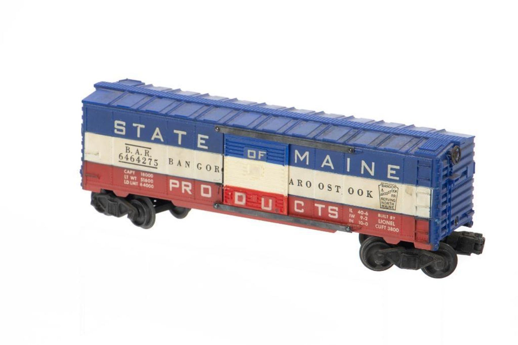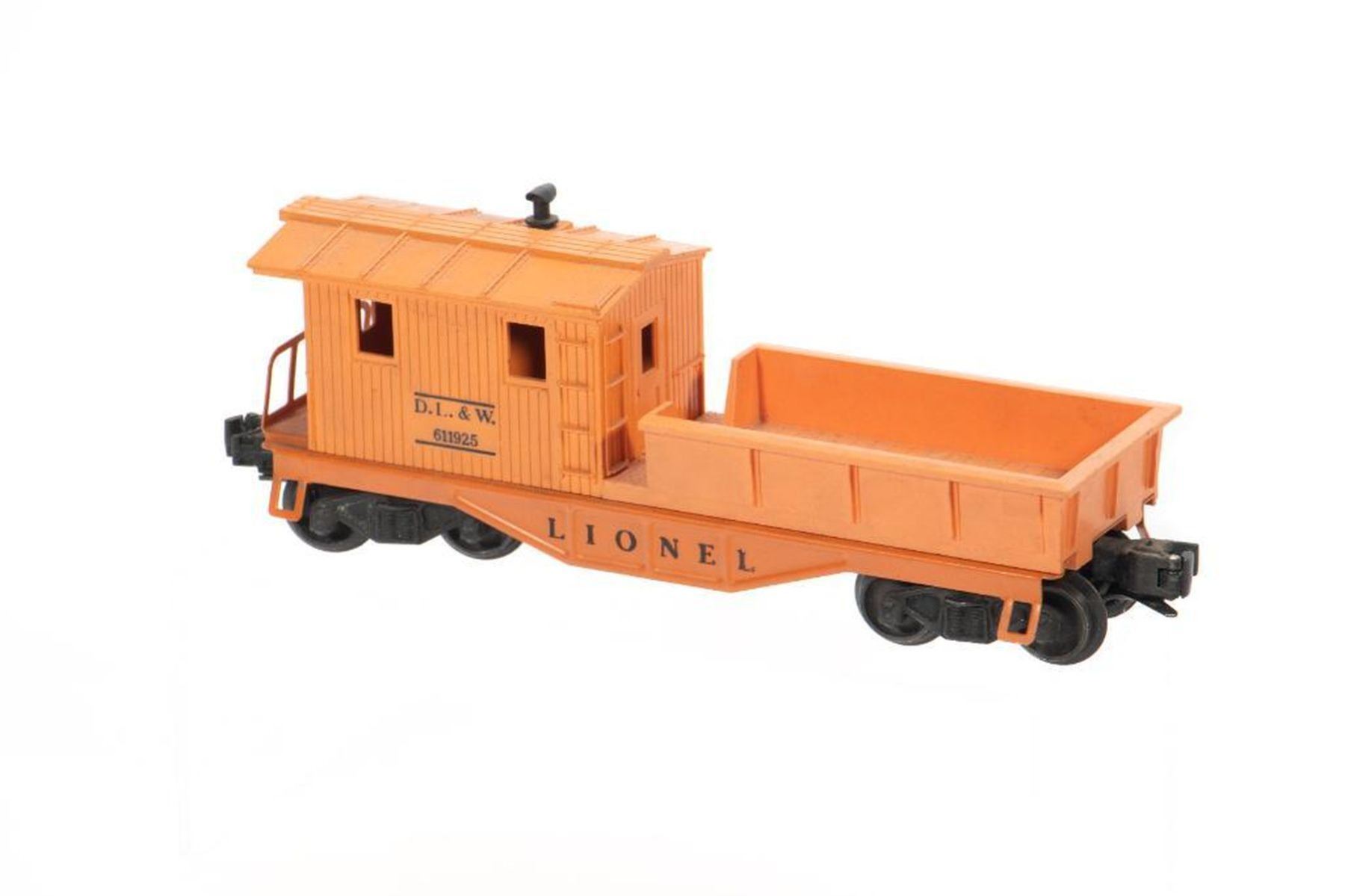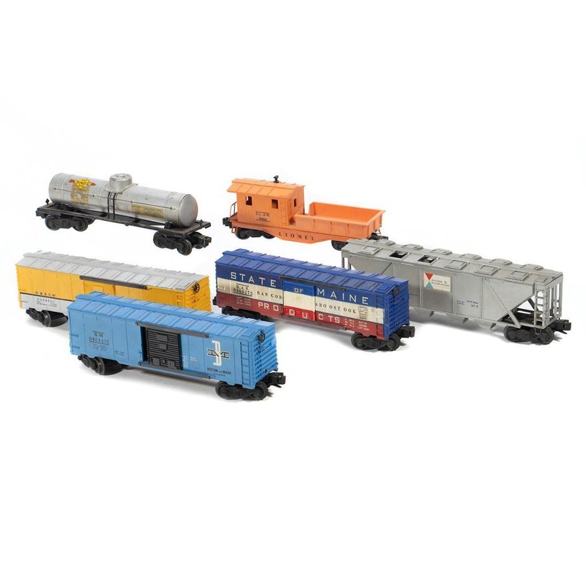 2955; Used Postwar; Lionel 2955 Single Dome Sunoco Tank Car. Die cast frame has slight warp with the center higher than the ends. Decals and paint worn. Dusty. Hand rails, ladders, markers, brake wheel, trucks and couplers are intact. No. box. 6464275; Used Postwar; Lionel 6464275 Bangor and Aroostook/State of Maine Box Car. Roof walk ends, door guides, doors, brake wheel, trucks and couplers are intact. Dusty. Paint wear on ladders and grab irons. No box. 6464650; Used Postwar; Lionel 6464650 Denver and Rio Grande Western box car. Roof walk ends, door guides, doors, brake wheel, trucks and couplers intact. Dusty. No box. 6464475; Used Postwar; Lionel 6464475 Boston and Maine box car. Roof walk ends, door guides, doors, brake wheel, trucks and couplers intact. Dusty. No box. 6346; Used Postwar; Lionel 6346 Alcoa Aluminum quad covered hopper. Roof walk ends, steps, end frames, brake wheel, trucks and couplers are intact. Two missing hatch covers. Dusty. No box. 6119; Used Postwar; Lionel DL&W orange work caboose. Stack, roof walk ends, roof corners, steps, end frame, trucks and couplers are intact. Dusty. No box.
