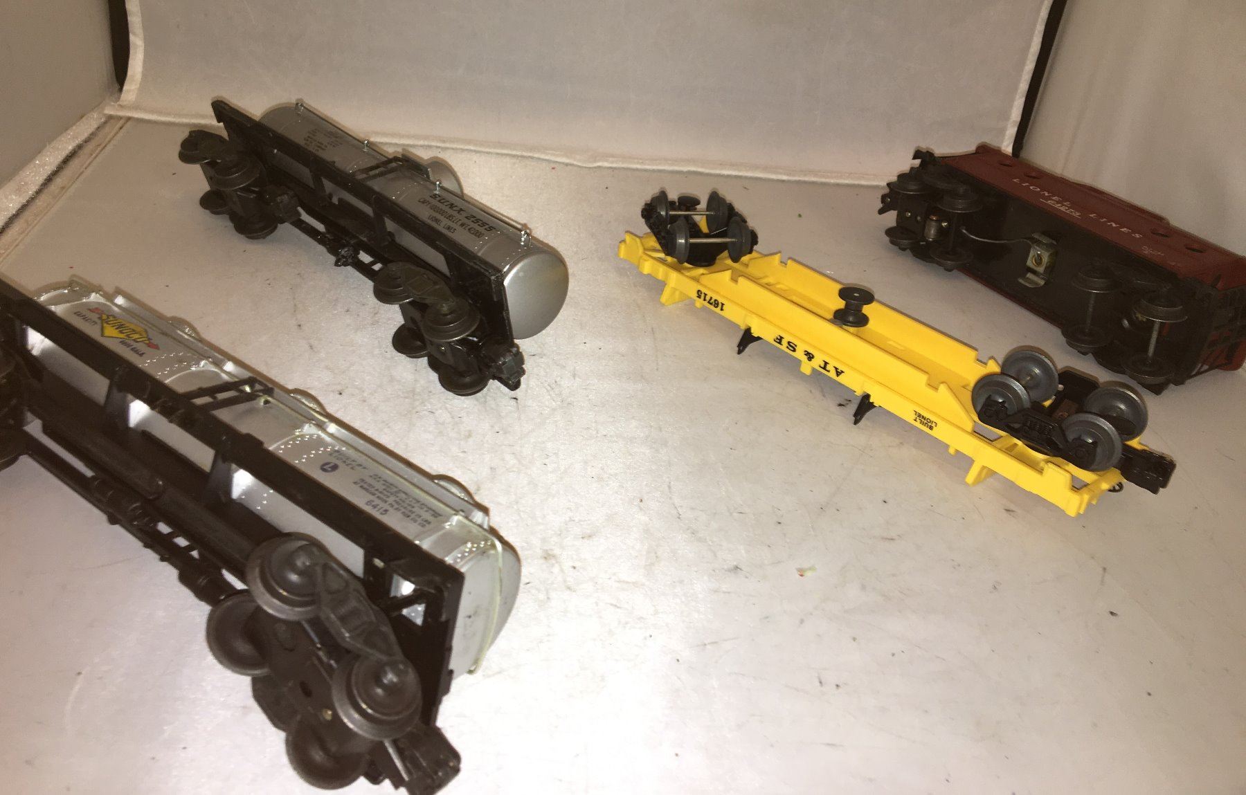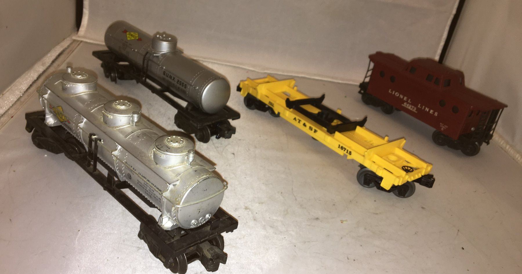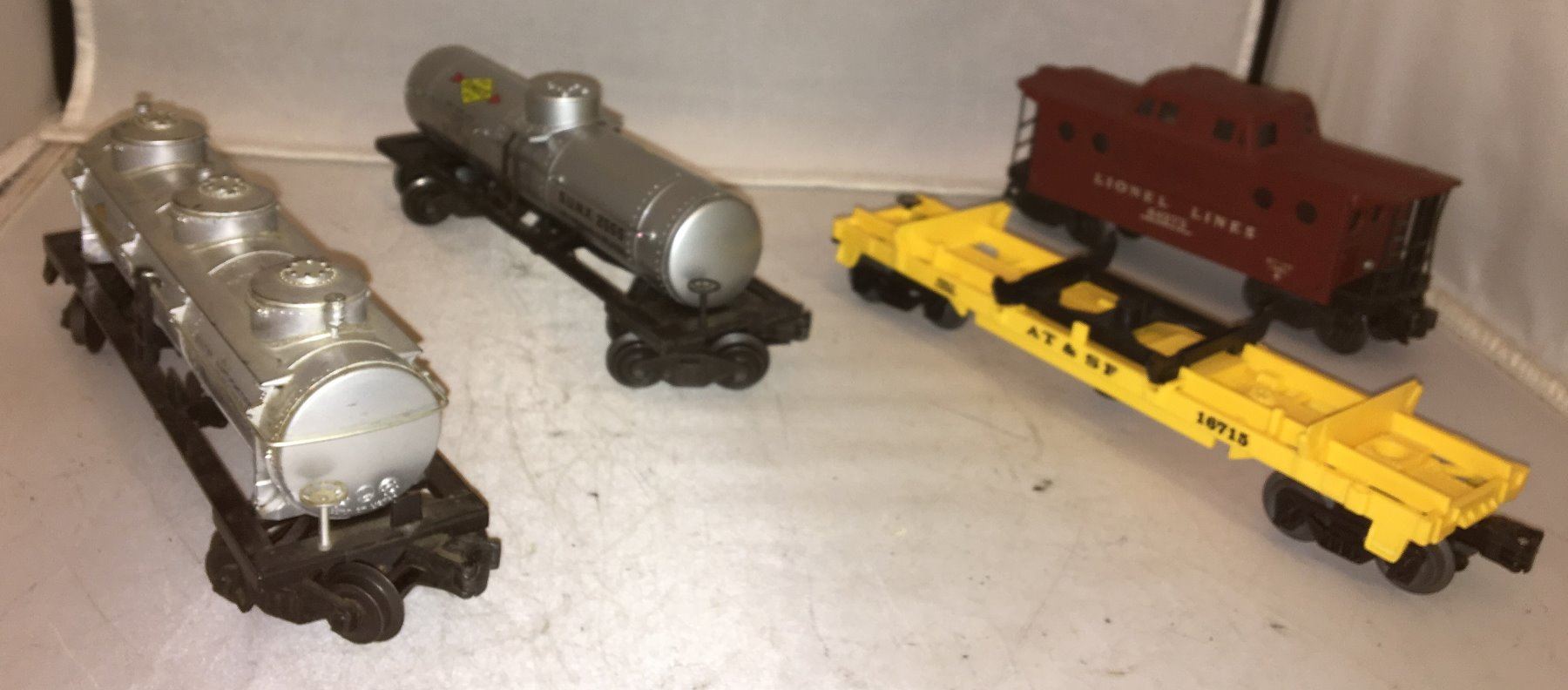 Three (3) Lionel Postwar O gauge freight cars plus a Lionel 16715 operating lumber car. The Postwar freights are a 2555 Sunoco single dome tank car, a 6415 Sunoco triple dome tank car, and a 6427-3 Lionel Lines porthole caboose.