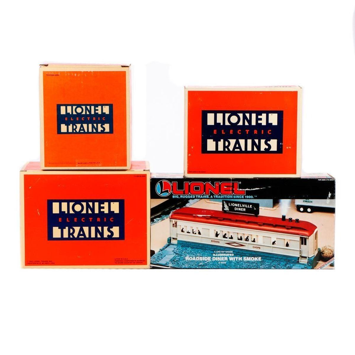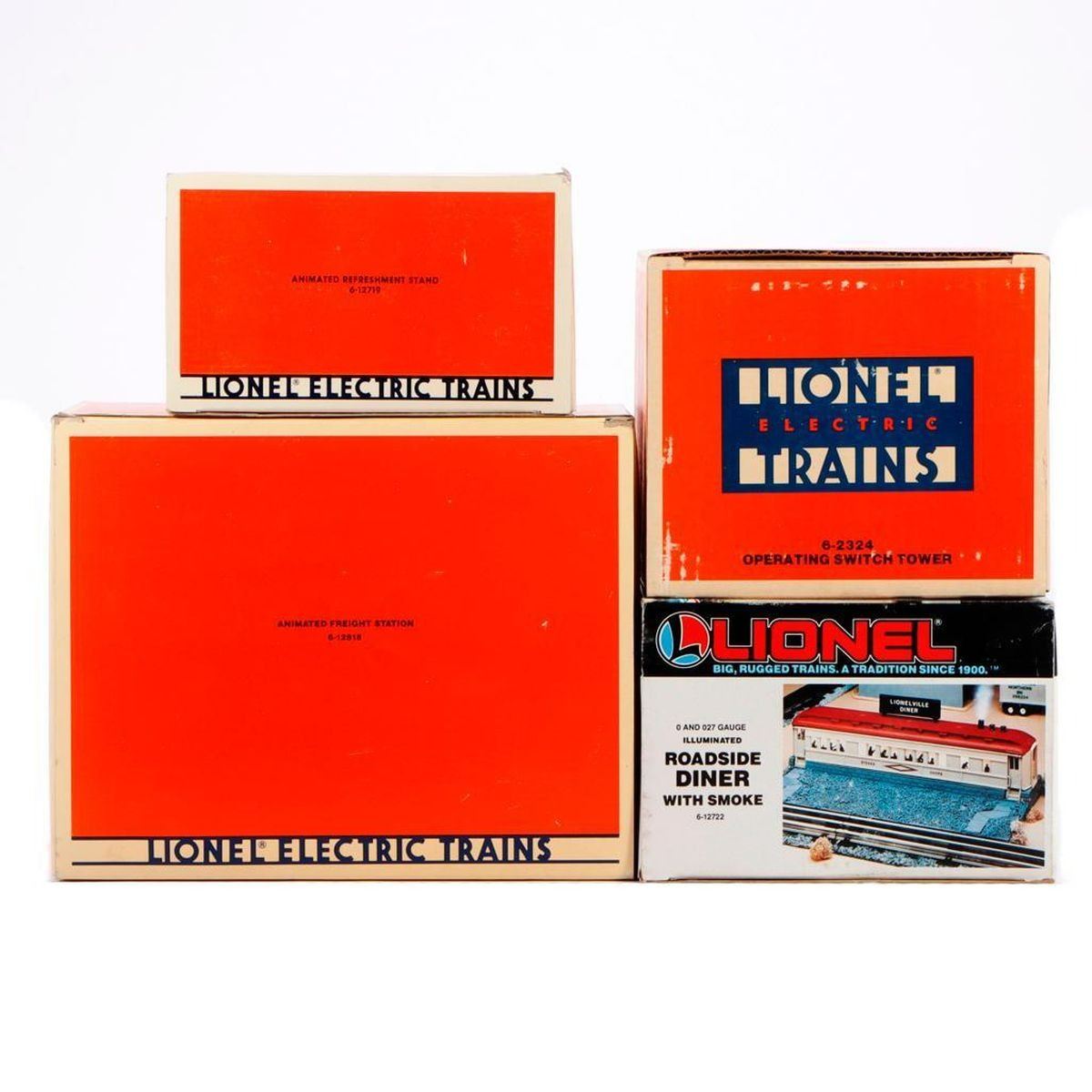 Lionel Accessories in original boxes 6-12719 Animated Refreshment Stand 6-12722 Illuminated Roadside Diner with Smoke 6-12818 Animated Freight Station 6-2324 Operating Switch Tower All in original shelf worn boxes - appear unused.
