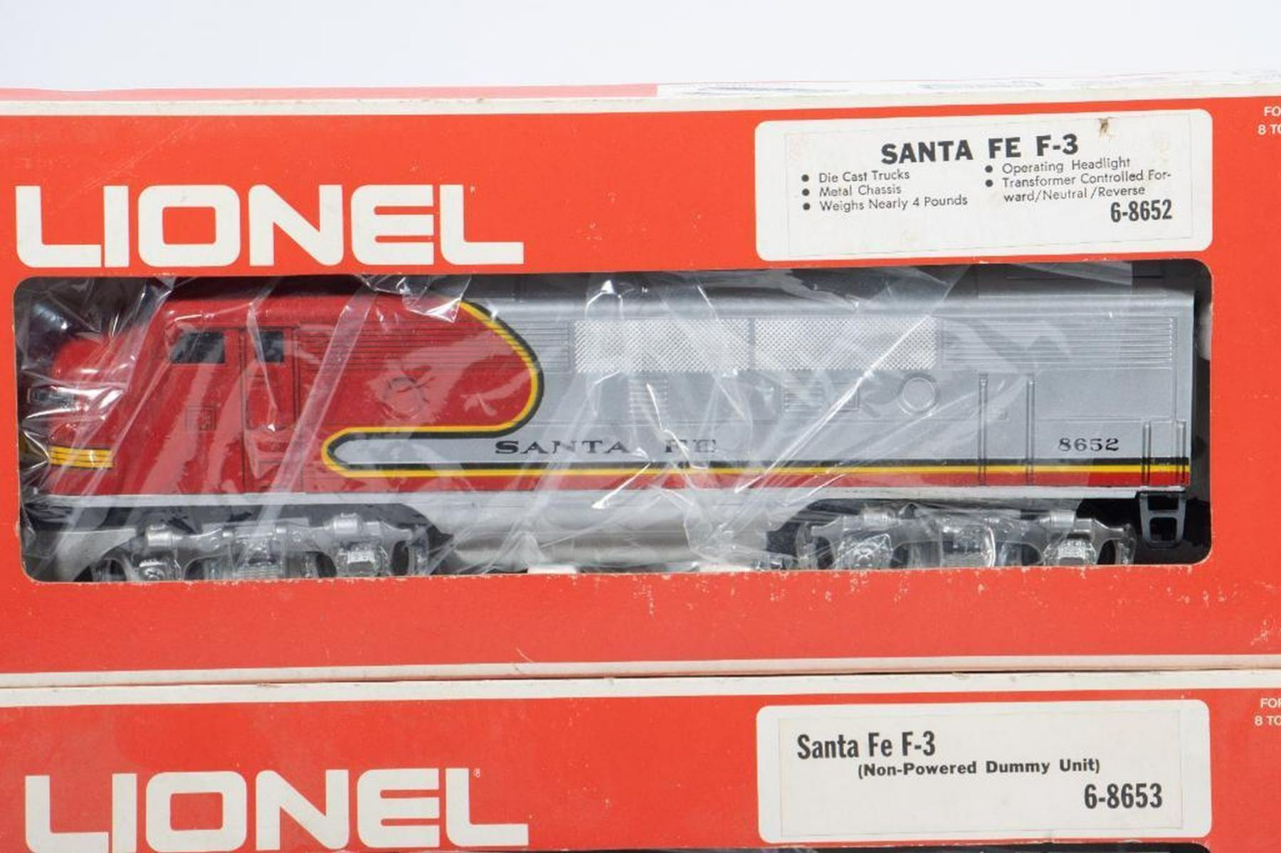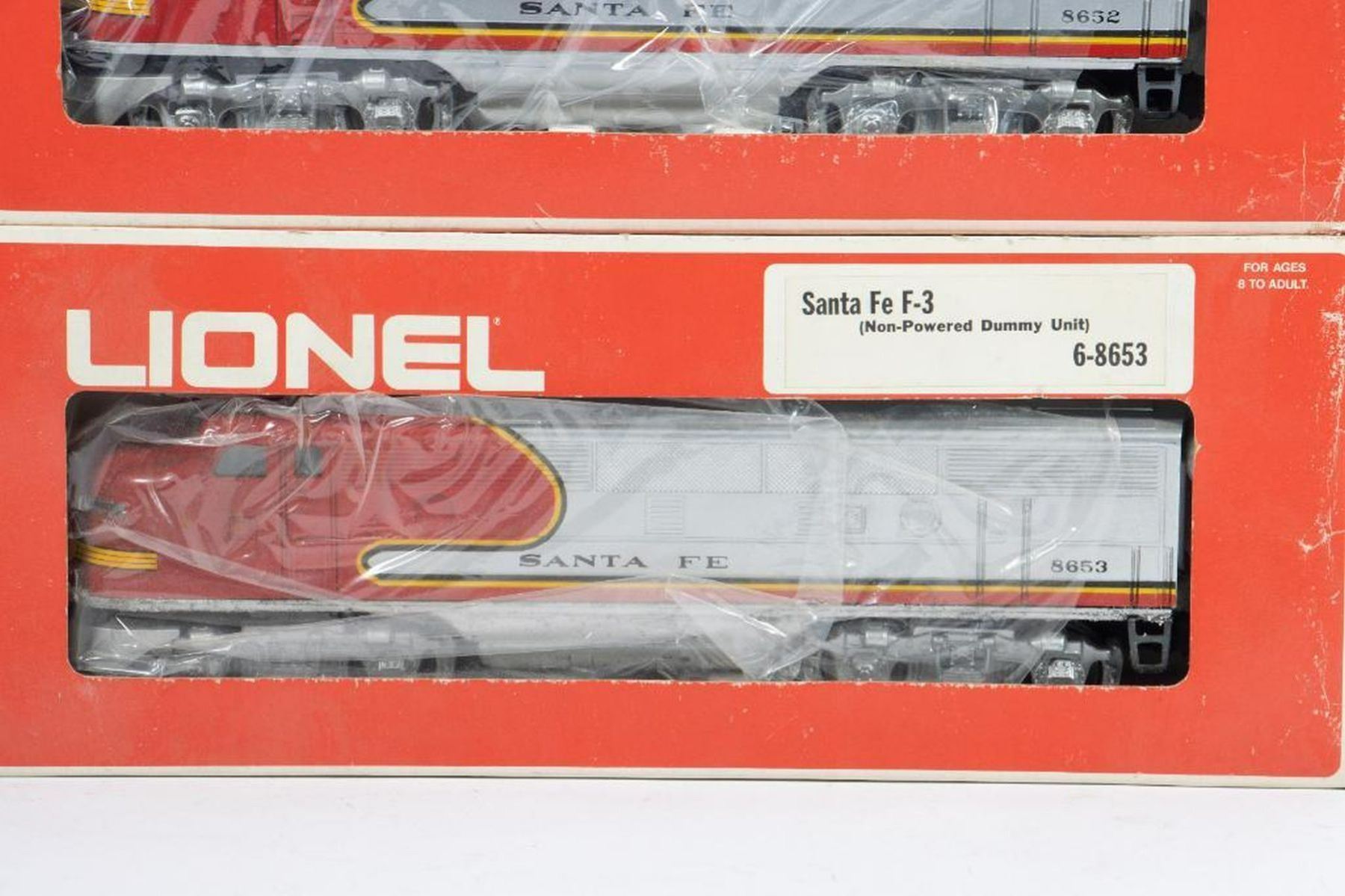 Lionel Santa Fe F-3 A-A: 6-8652 Powered Unit in original box 6-8653 Dummy Unit in original box Boxes have shelf wear and tear and clear windows on box fronts are missing.