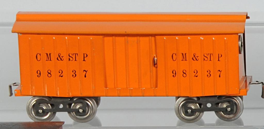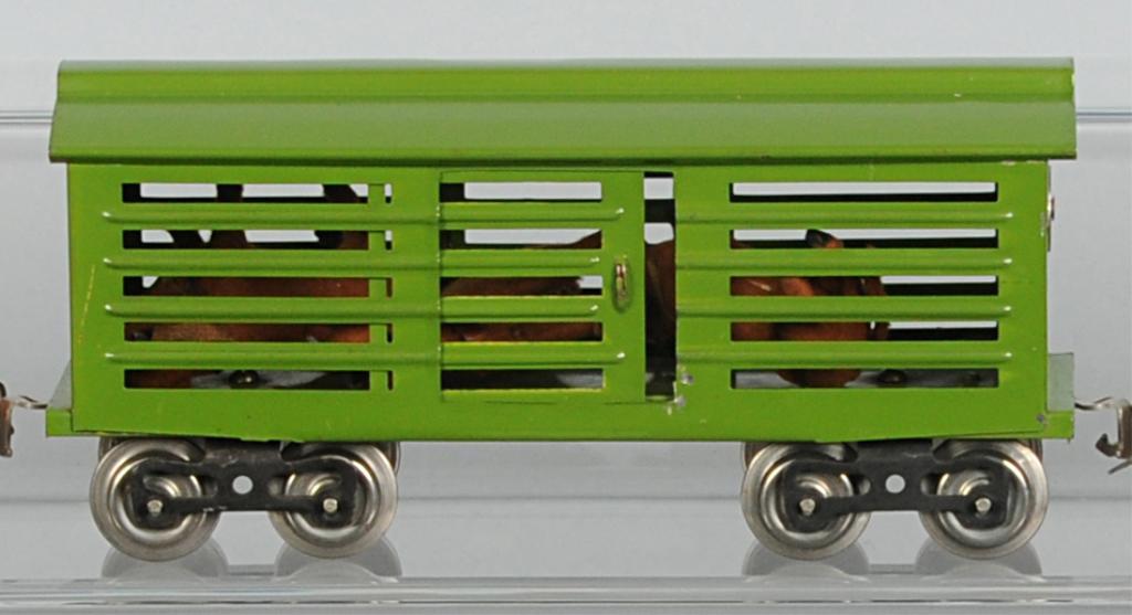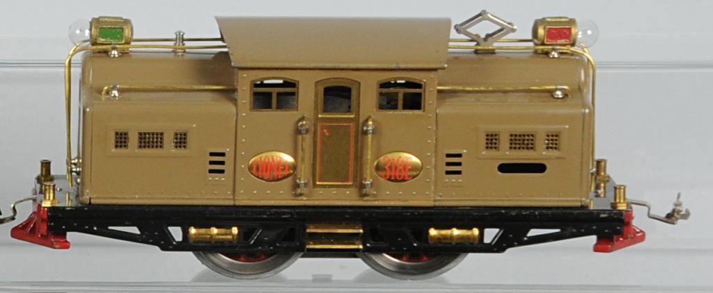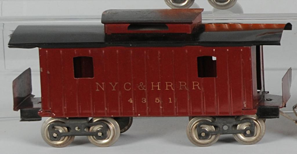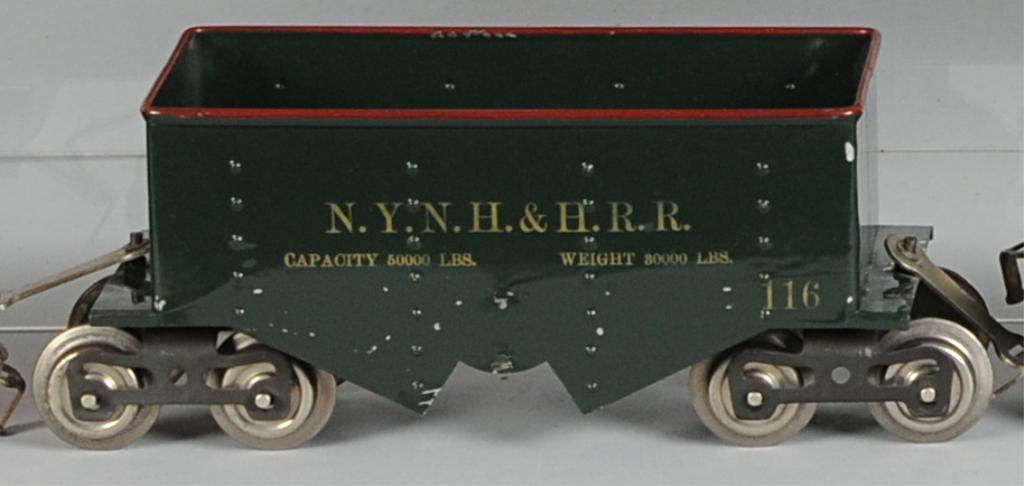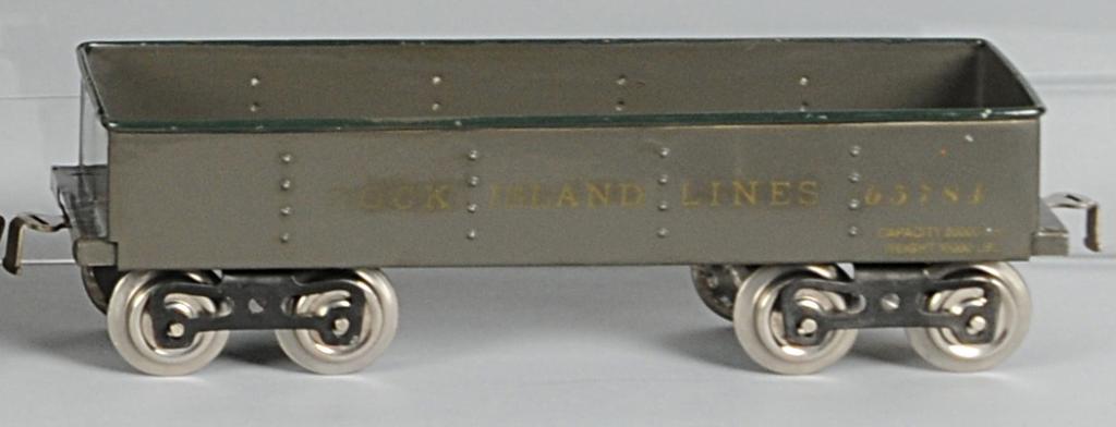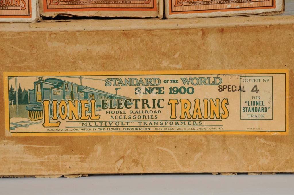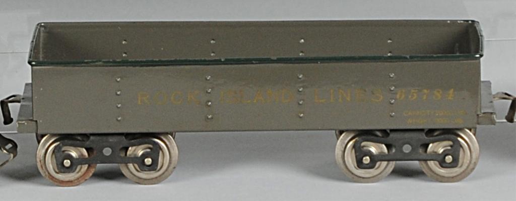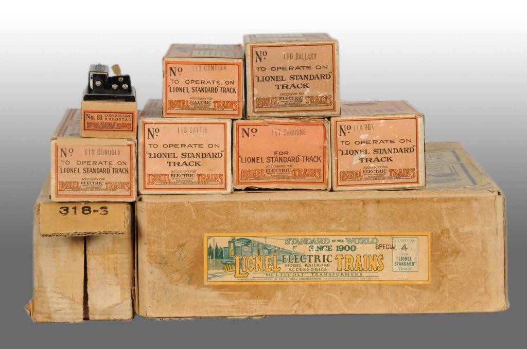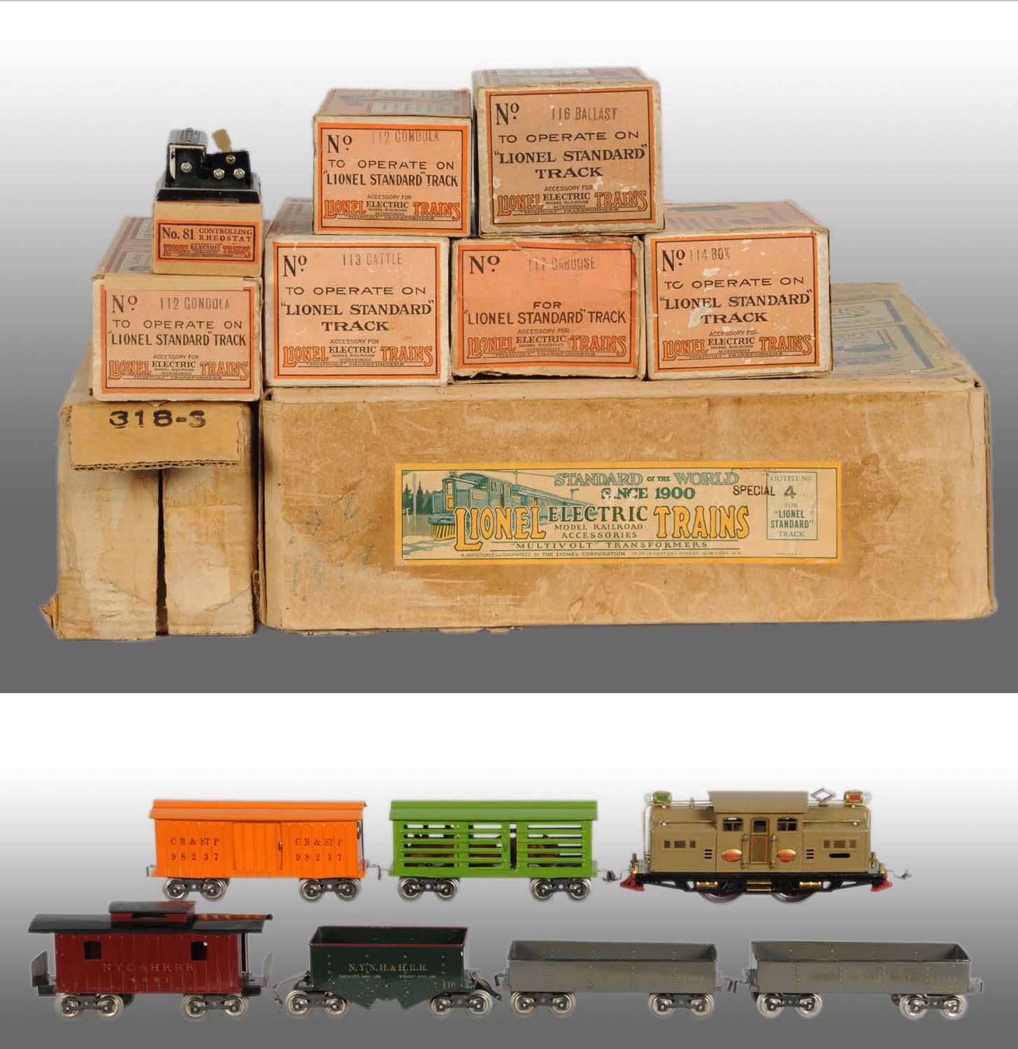 Department Store special set is extremely rare with original set box and very nice individual boxes with all flaps present. Set includes 318E scarce mojave locomotive, two 112 Rock Island gray gondolas, 114 orange boxcar, 113 green cattle car, 116 dark green with maroon trim ballast car, and 117 maroon caboose. Individual boxes are excellent plus. Mojave 318E locomotive has slight flaking to one side in two spots, otherwise excellent plus condition. All cars are free of blemishes and are excellent plus to like new condition. Extremely rare set. Pre-war Train