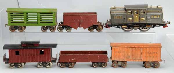Description Includes 318 electric engine in gray, NYNH coal car, 65784 Lakeshore gondola, 113 cattle car missing one door, 98237 boxcar, and 4351 NYC caboose. Set has moderate overall wear and scratching. Condition (Good - Very Good).
