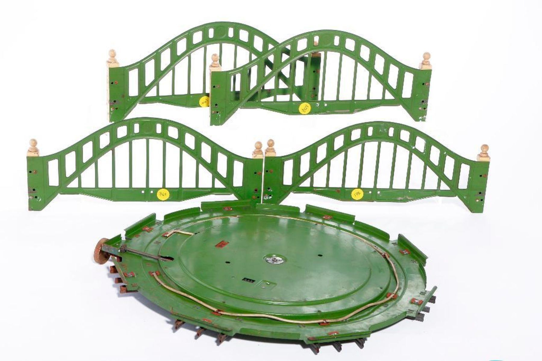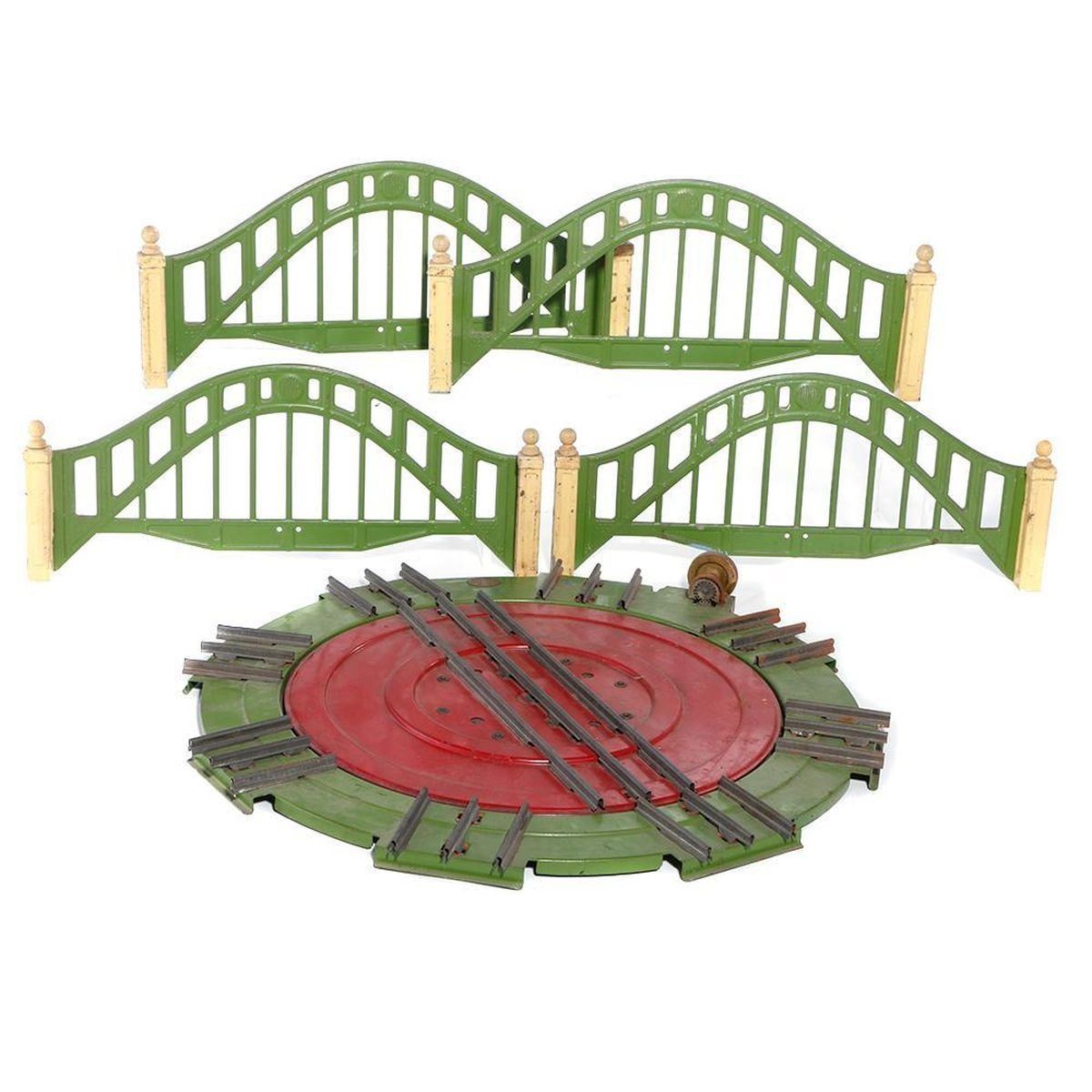 Four side sections for a 102 arch bridge (needroadbed support base panels); #200 manualoperated turntable (needs cleaning), C-4. Buyer pays shipping costs.
