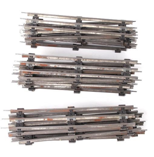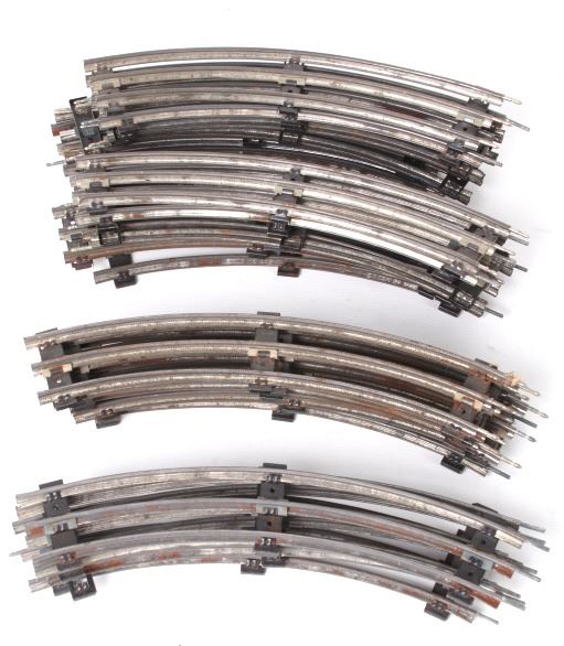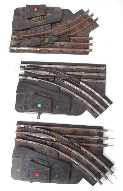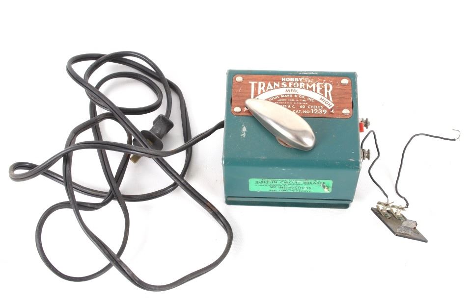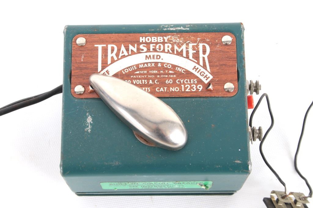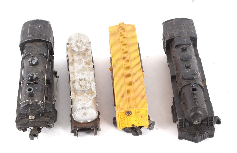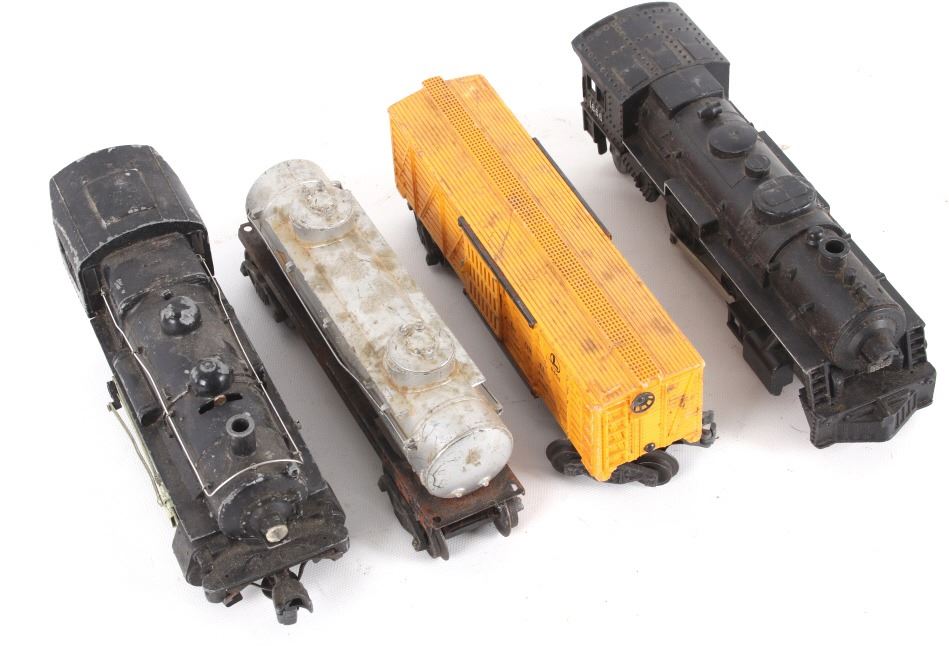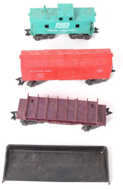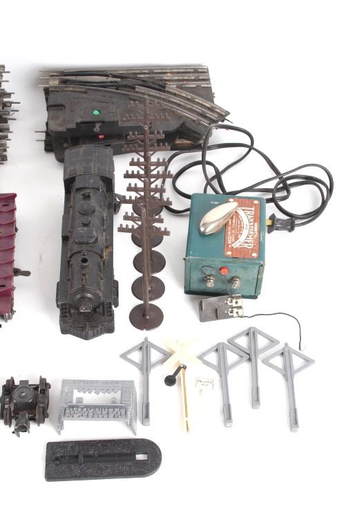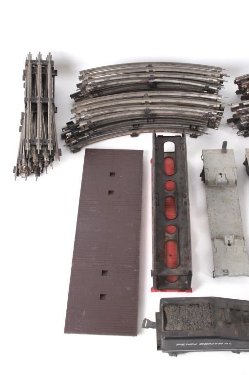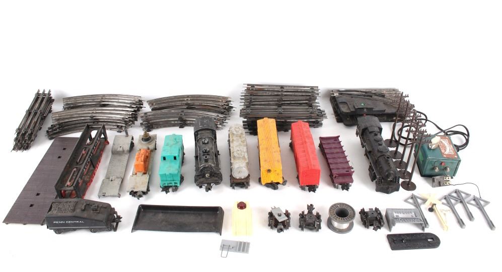 Featured in this lot is this collection of Lionel switchers and car trains with original tracks. The collection includes professionally crafted switchers and train track cars including a Lionel 1615 switcher and 1666 switcher and includes cars such as Lionel Sunoco tanker, Lionel Lines 6656 crate car, Erie log car, Lionel lines 6561 flat bed, Lionel 6414 Auto Loader, B&O 467110 crate car, Penn Central coal car, Penn Central 18328 Passenger car, and Lionel 3620 Equipment car. The collection comes complete with a plethora of track and shows a Hobby Transformer switch. The condition of this train set is fair with some wear to the cars included in this train set with a couple cars missing wheels and but otherwise shows fair overall condition. The measurements of this collection of train set is 3 1/2" x 9" x 2 3/8" to 2" x 8 1/2" x 2 3/4".