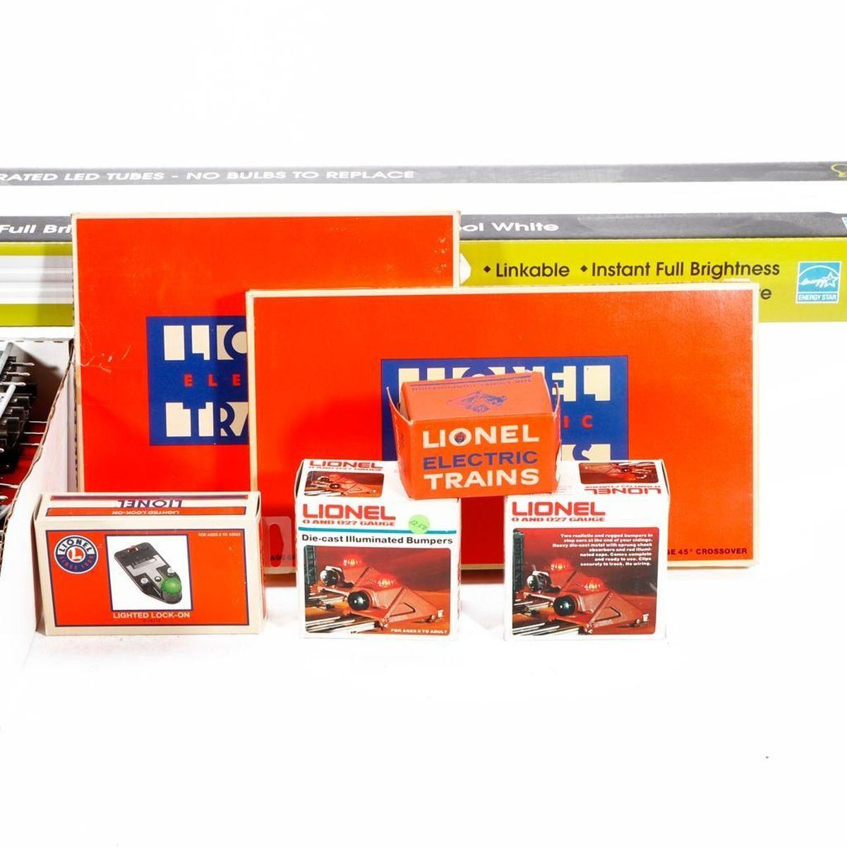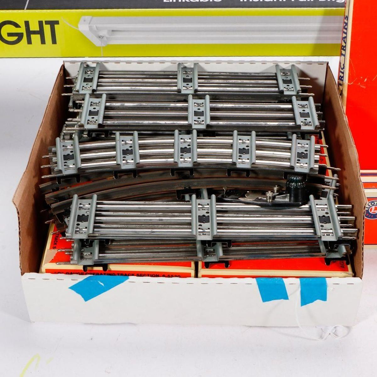 Lionel Track Items in original boxes and more 6-2283 Two Illuminated Die-cast Metal Bumpers 6-2283 Two Illuminated Die-cast Metal Bumpers 6-5545 "O" Gauge 45 Degree Crossover 6-5540 "O" Gauge 90 Degree Crossover 6-5530 "O" Gauge Operating Track Section - track section and push button 6-5530 "O" Gauge Operating Track Section - track section and push button 6-5530 "O" Gauge Operating Track Section - track section - broken push button 6-5530 "O" Gauge Operating Track Section - track section and push button All are in original boxes but show signs of layout use. 5 sections Lionel O gauge 40 inch straight track 16 sections Lionel O gauge straight track 3 sections Lionel O gauge curve track 2 Sections Lionel O gauge five tie curve track 3 Lionel CTC Lockon 6-14112 Lionel lighted lockon Postwar Lionel 260 Illuminated Bumper All show signs of layout use