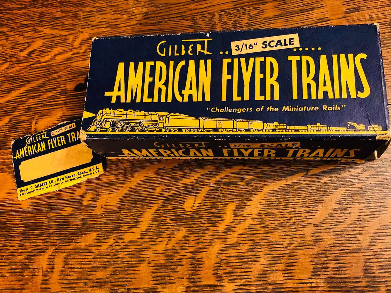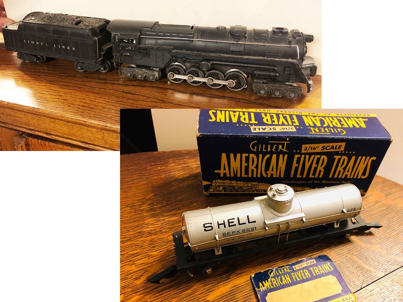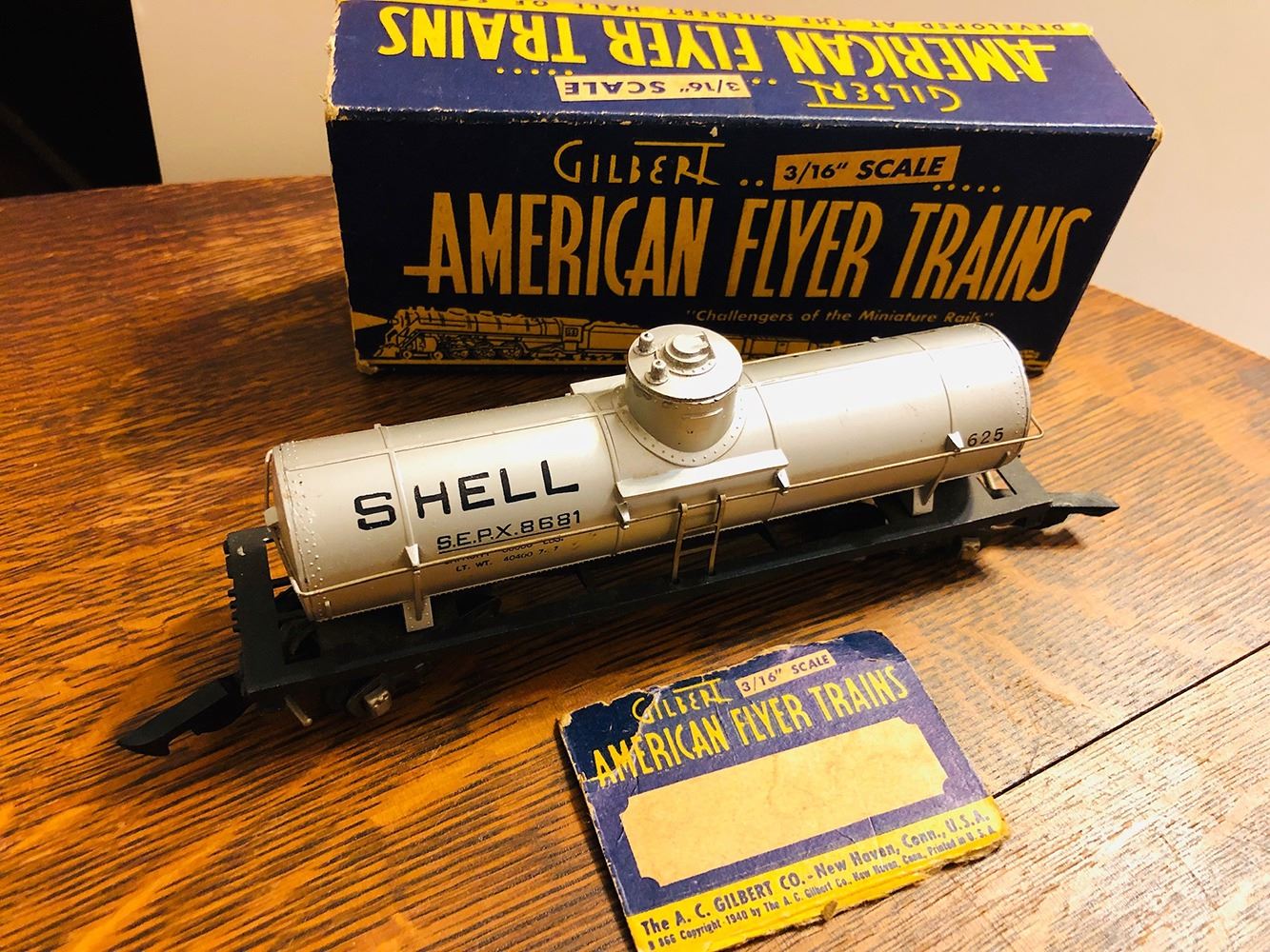 Lionel train engine and car #671, measures approx. 18" long and Gilert 3/16" Scale American Flyer Shell tanker in original box.