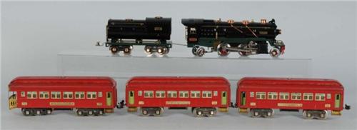 Description Includes 260E in black and 260T tender with two 710 passenger cars and one 712, all in red. Locomotive and tender are restored. Passenger cars have considerable flaking on window trim. Passenger cars are in good to very good condition.