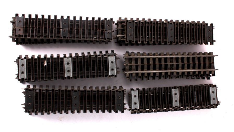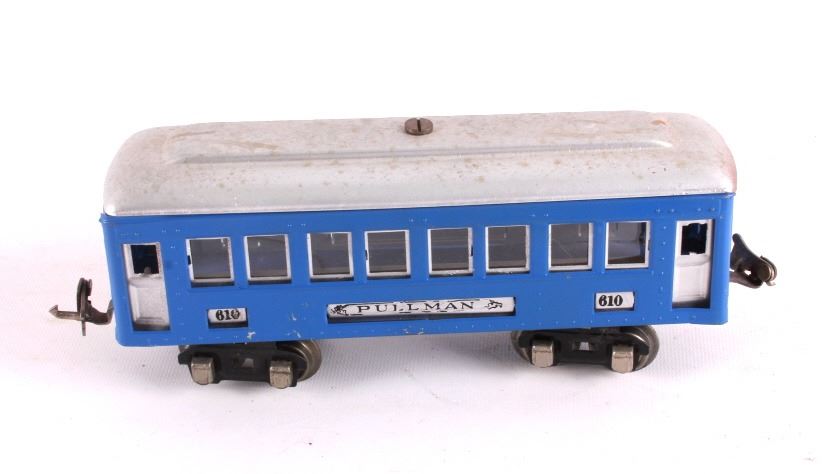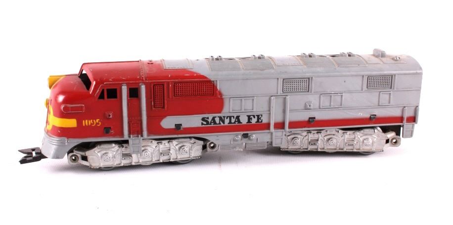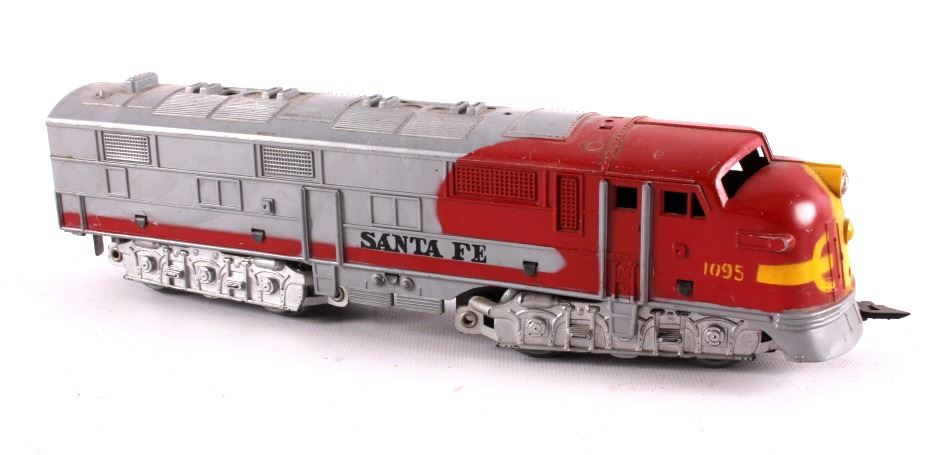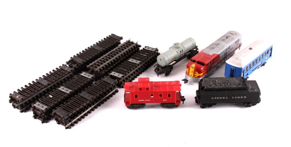 This is a collection of Lionel train cars and track. Included is a Santa Fe locomotive (not Lionel) with no motor (dummy engine), a Pullman 610 passenger car, tank car, caboose, coal tender, and numerous sections of track. The Lionel collection is in good condition.