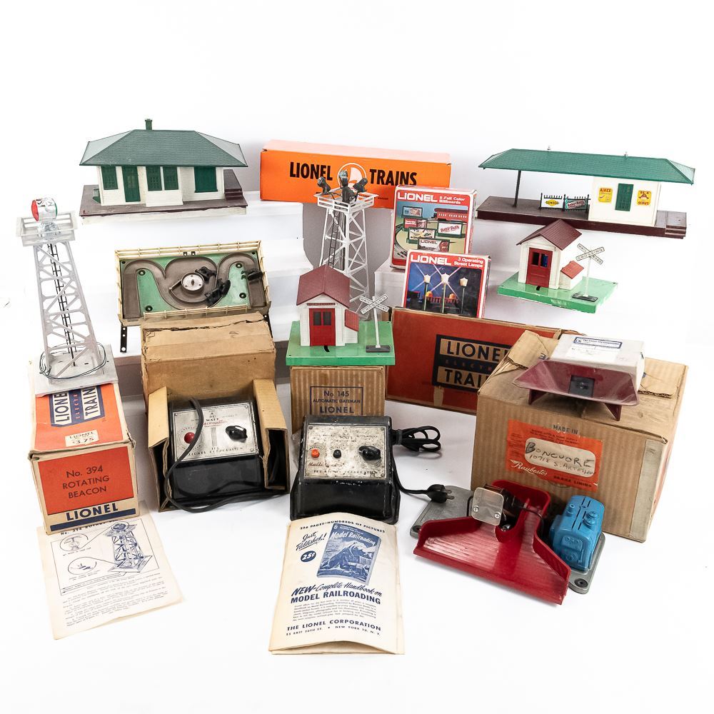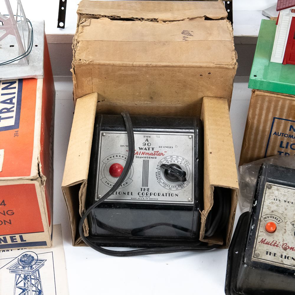 Collection highlights Lionel No. 110 Trestle Set w box, Type A Trainmaster w box, No 394 Rotation Beacon w Box, No 397 Coal Loader w box, No 145 Automatic Gateman w box, No 145 Auto Gateman no box, No. 020X track w box, Lionel No. 256 Freight Station no box, Type S transformer no box untested, Operational Streetlights w box, 5 Full Color Billboards w box, No. 395 Floodlight no box, No. 122 Passenger Station no Box, No. 3356 Horse Coral. Lots of fun... Perfect addition to your layout. Please use photos to judge condition and bid accordingly.