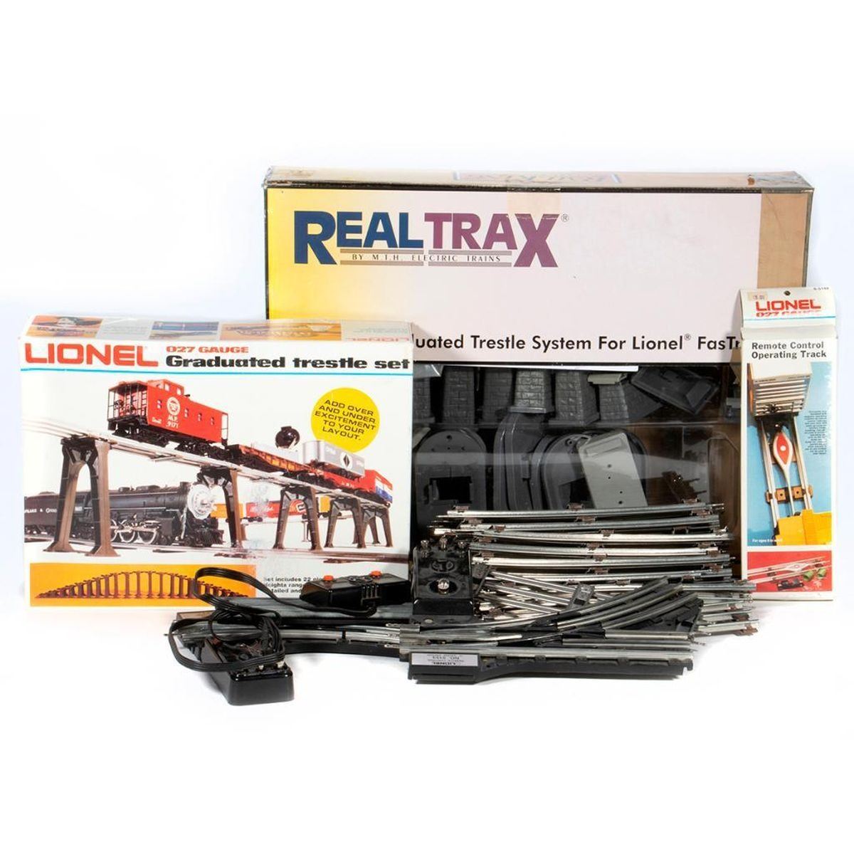 Lionel 22 Piece Set of Track Risers; High Trestles; 5132 Remote Control Right Switch; 5133 Remote Control Left Switch (no controls); (16) pieces O-27 Curve Track; (2) pieces O-27 Straight Track; (1) piece O Gauge Half Curve Track; 6-5149 Remote Control Operating Track; UCS with control; MTH 40-1113 24 Piece Fast Track Riser Set
