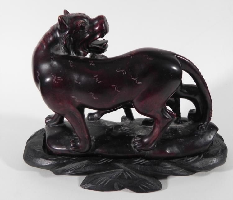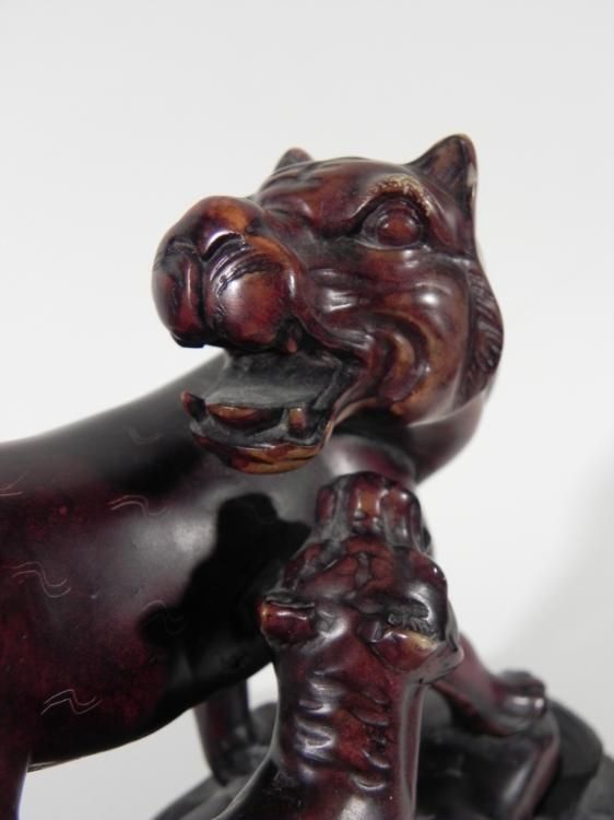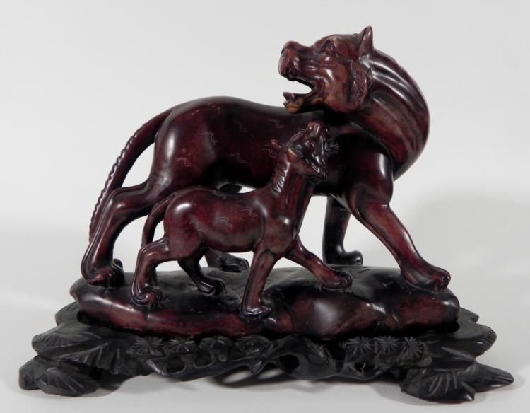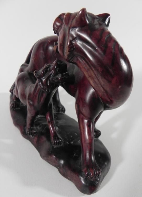 This sculpture portrays a strong lioness fiercely protecting her cub. It has a bold form in dark brown, with etched surface details. * * Artist: There is no name marked, but there are some markings underneath * Medium: Heavy, solid composite material, on removaeable custom wooden stand * Dimensions: 3 x 6 x 8 inches * Condition: Excellent