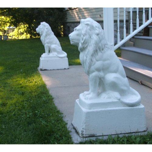 Cast Stone. Matching cast garden statues depicting seated lions on a pedestal base. 34" high