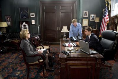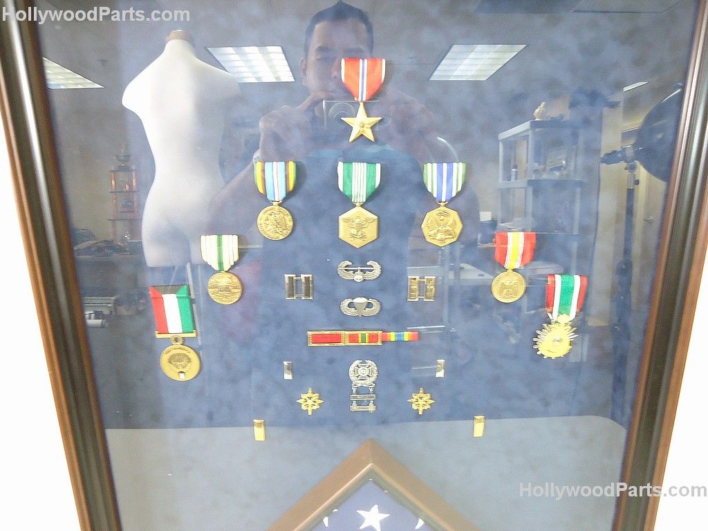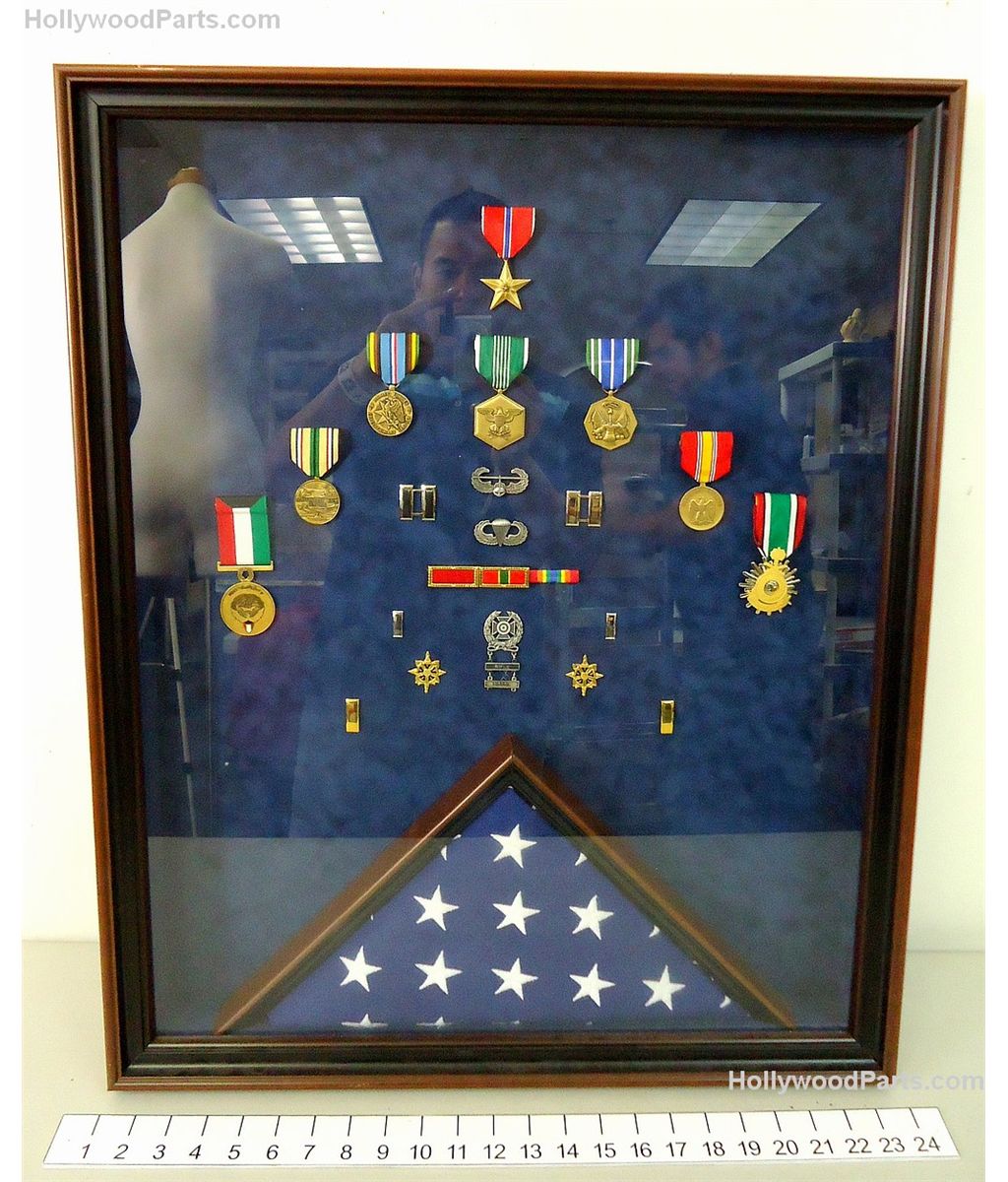 Prop shadow box with military pins and folded American flag. Shadow box is made of brown and black wood. The box contains 22 medals with and without ribbons, pins and bars on a mottled blue background behind glass. Dimensions: 22 1/2" x 27 1/2". See above couch in Senator Jasper Irving's (Tom Cruise) office.