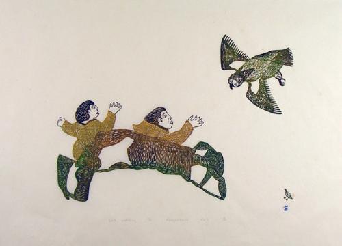 [Canadian, Pangnirtung b. 1943] BIRD WATCHING; 1974 Colour stonecut on paper; Ed. #7/50 22.25 x 30.75 ins. Titled, dated & editioned Bears artist's and cooperative stamps