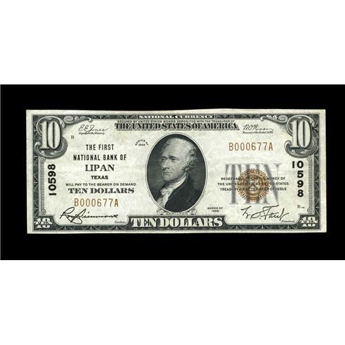 <B>Lipan, TX</B></I> - $10 1929 Ty. 1 <B>The First NB </B></I> Ch. # 10598<BR>A nice <B>Extremely Fine</B></I> example from the only bank to issue in this small Hood County community. Bright, original and well margined, this piece boasts considerable eye appeal and has only the most minimal evidence of any circulation at all.