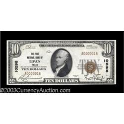 <TABLE cellSpacing=0 cellPadding=0 width="100%" bgColor=#000000 border=0><TBODY> <TR><TD width="100%"><TABLE cellSpacing=1 cellPadding=3 width="100%" border=0><TBODY><TR><TD width="100%" bgColor=#79735c><FONT face=arial color=#ffffff size=3><B>Description</B> </FONT></TD></TR><TR><TD width="100%" bgColor=#ffffff><FONT face=arial size=2><B>Lipan, TX</B></I> - $10 1929 Ty. 1 <B>The First NB </B></I>Ch. # 10598<BR>This is the only serial number one example reported to date from this small (and very scarce) Hood County bank. <B>Gem Crisp Uncirculated,</B></I> a prize from the Florida collection. (2,500-3,500 ) </FONT></TD></TR></TBODY></TABLE></TD></TR></TBODY></TABLE><BR><TABLE cellSpacing=0 cellPadding=0 width="100%" bgColor=#000000 border=0><TBODY><TR> Important notice: Heritage usually auctions material at the rate of 200-250 lots per hour. On some occasions eBay Live bid software or the Internet may not be able to keep up with the pace of the auction. We recommend placing a realistic absentee bid now as insurance to avoid disappointment. Occasionally the auctioneer may eliminate or reject an eBay Live bid, and the auctioneer may also reopen a lot after the close of the eBay live bidding (usually because we missed an audience bid), and may reject your bid even if it shows you as the winning bidder. By bidding via eBay Live, you agree that Heritage may award the lot to another bidder at its sole discretion under the circumstances described above or any other reasonable circumstances. Also please note that all Heritage lots purchased through eBay Live carry a 20% Buyer's Premium. Please make sure you read the Terms and Conditions before you bid.</TR></TBODY></TABLE>