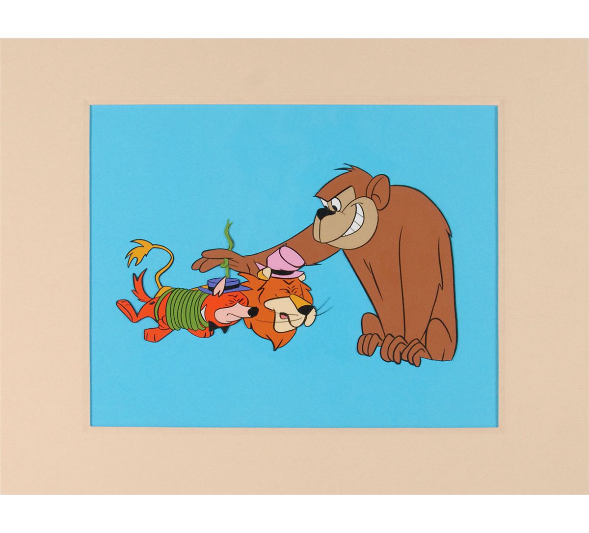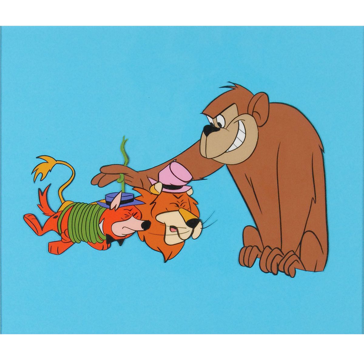 (Hanna-Barbera Studios, 1962) Original production cel featuring Lippy the Lion and Hardy Har Har from the opening of their cartoon. Image of Lippy and Hardy Har Har being used as a yo-yo by a gorilla measures 8 x 4.5, with a mat opening of 9.5 x 7.5. Mat dimensions are 14 x 10.75. In fine condition.
