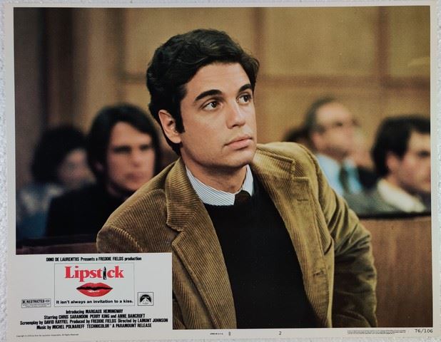 Lipstick (Paramount Pictures, 1976) lobby card. Drama. Starring Margaux Hemingway, Chris Sarandon, Anne Bancroft, Perry King, Robin Gammell, John Bennett Perry, Mariel Hemingway. Directed by Lamont Johnson. Mint. (11"x14").