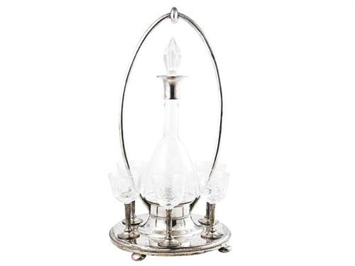 Silver stand 439 g. Blown and cut tintless glass bottle and six cups on silver base. Metal replacement on the rim of the bottle. One silver base is also replaced. Marked: Austrian, circa 1900, Eduard Friedmann. Neuwirth: I/194. Size: 39 cm