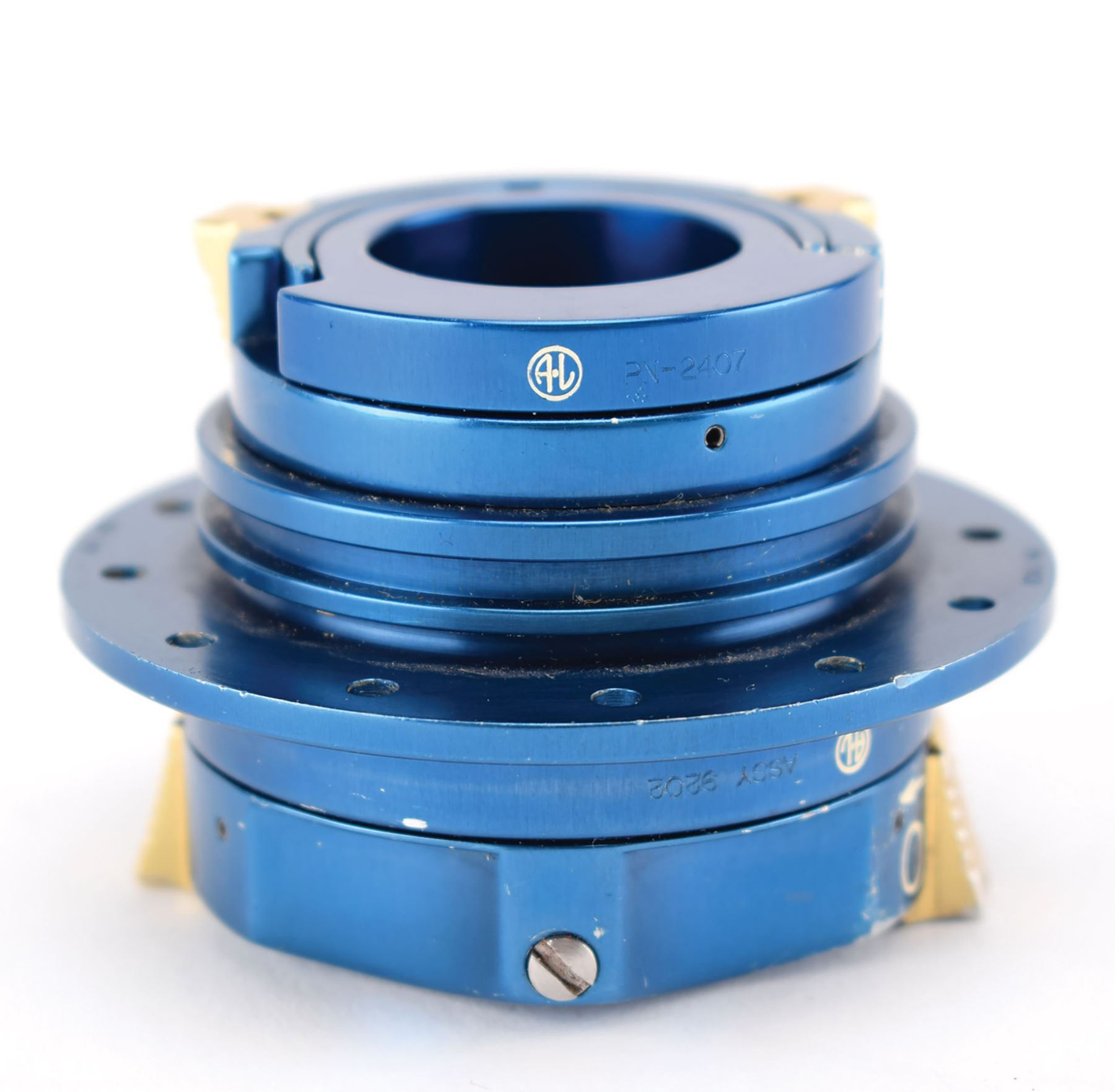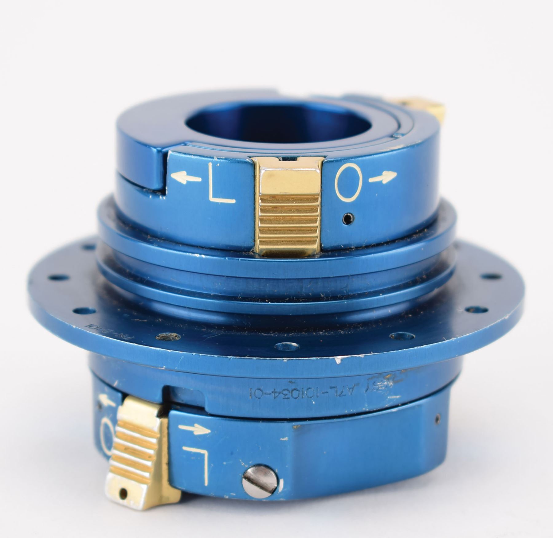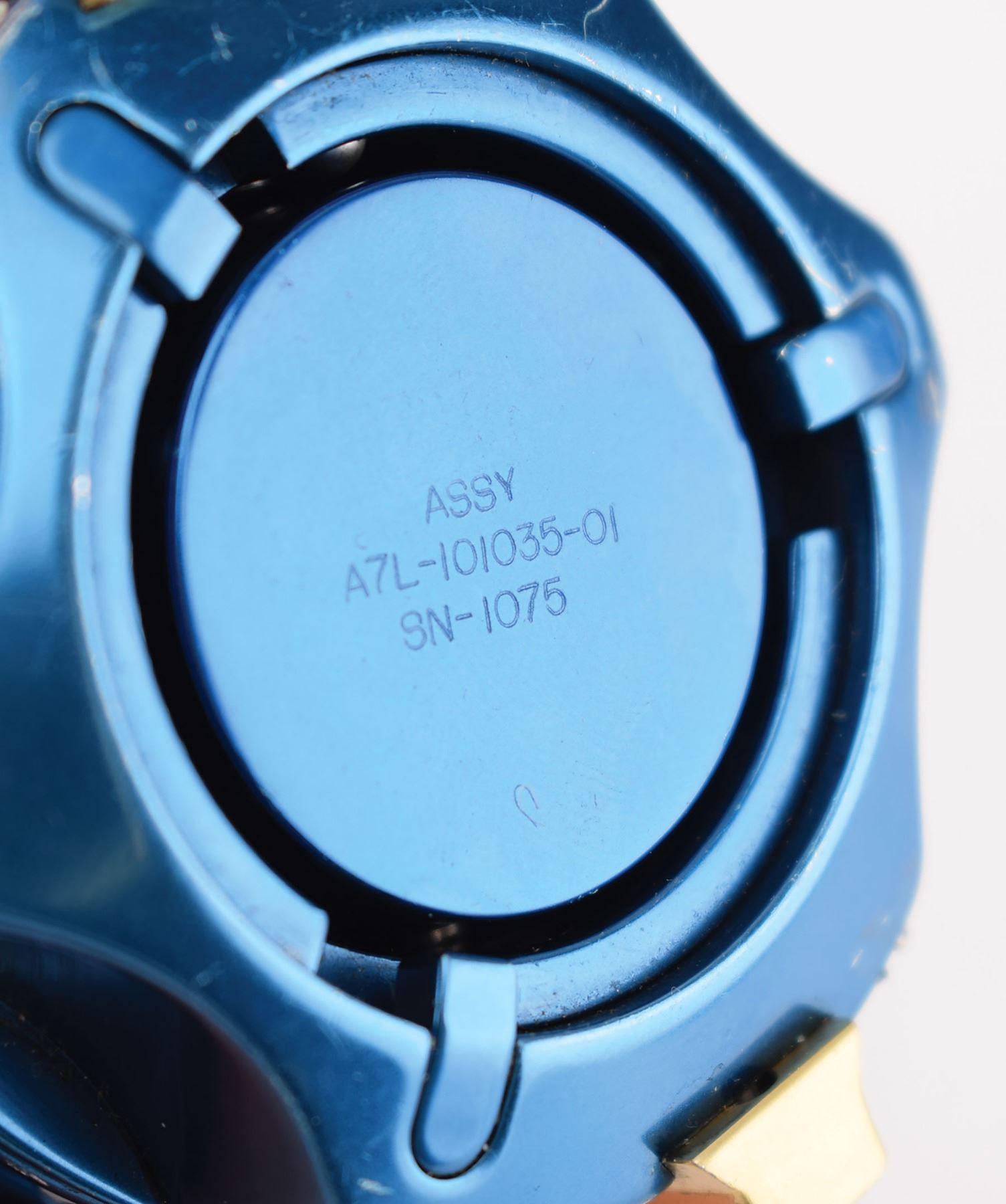 Apollo-era blue metal Liquid Cooling Garment (LCG) hardware connector made by Air Lock, measuring 2.75? in diameter and 2? thick, with upper portion bearing part numbers, "ASSY, A7L–101035–01, SN–1075" and "ASSY A7L–101034–01, SN–240, ASSY 9202," and plate connector marked, "PN–2401, SN–240." In fine condition. This connector would allow the water connector from the backpack to connect to the space suit from the outside; the LCG hardware would only be connected once the astronaut was inside the suit.
