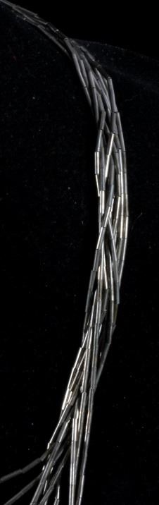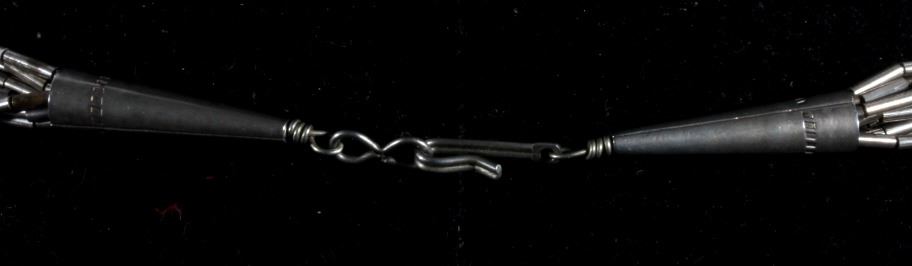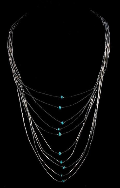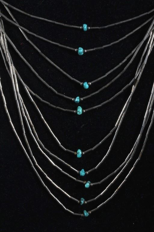 Up for consideration is a Navajo liquid silver multi strand necklace. Each strand has a nugget of turquoise at its center. The ten strands are interwoven and have varying lengths. Necklace measures 13" long when clasped.